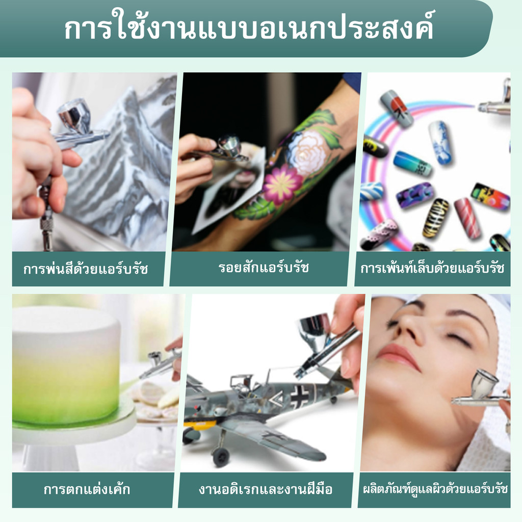 พู่กันมืออาชีพนี้ใช้กันอย่างแพร่หลายในการทำโมเดลตกแต่งเค้กรอยสักเล็บ ฯลฯ ปืนพ่นสีรุ่นนี้ให้ความรู้สึกเหมือนปืนพ่นสีในขณะที่ให้การควบคุมสเปรย์ของพู่กันที่แม่นยำ