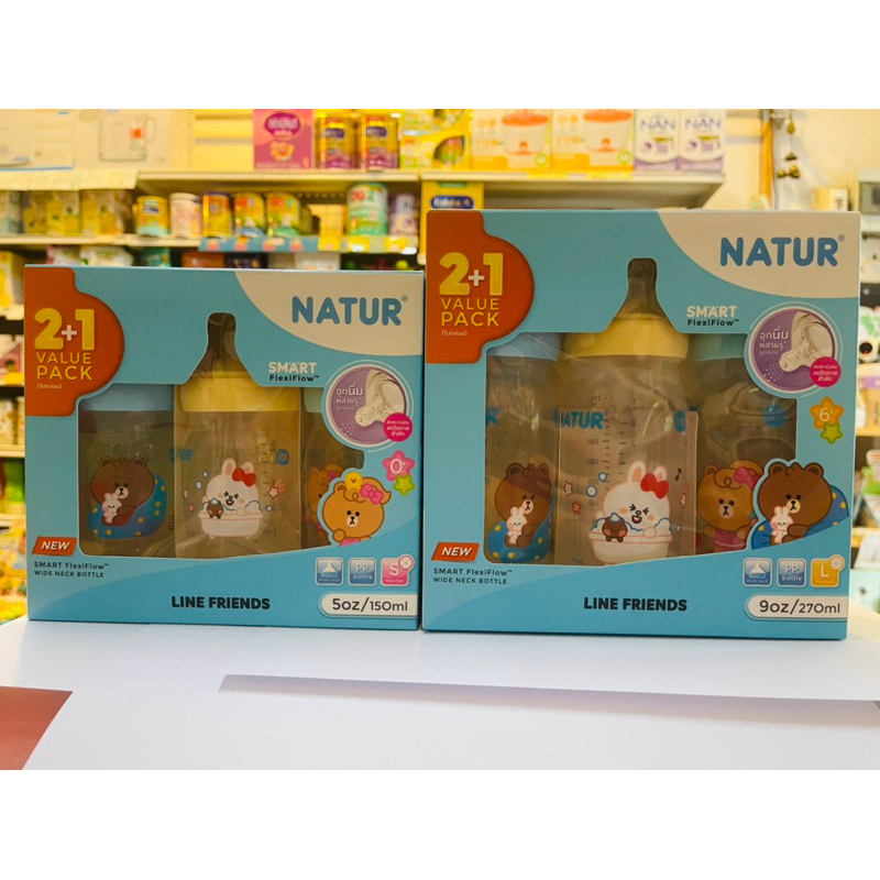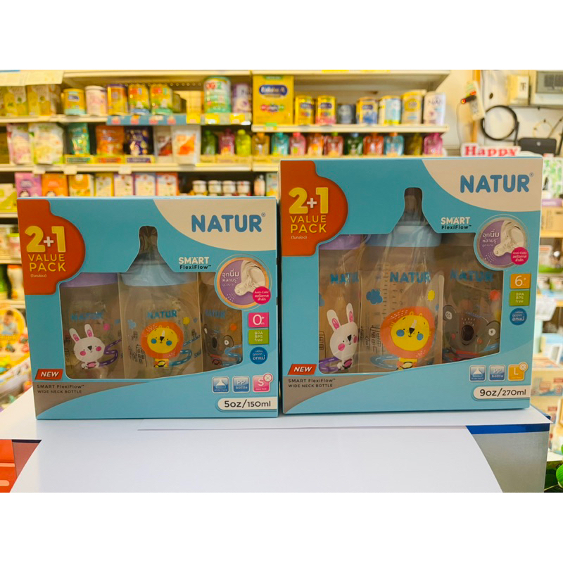 Natur ขวดนมคอกว้าง 5oz, 9oz (2 ฟรี 1 ขวด) พร้อมจุกนม FlexiFlow