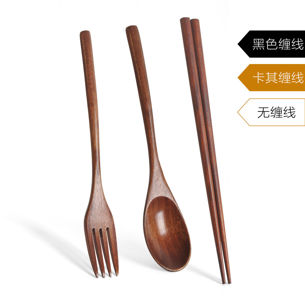 in stock#Japanese Style Wrapping Wooden Spoon Fork Three-Piece Set Including Chopsticks Long Handle Solid Wood Adult Portable Spoon Fork Cloth Bag Tableware2tk