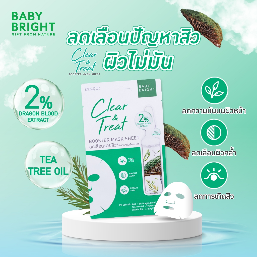 เบบี้ไบร์ท เคลียร์ แอนด์ ทรีท บูสเตอร์ มาส์ก ชีท สูตรเพื่อผิวเป็นสิวง่าย อุดมไปด้วยน้ำมันทีทรีและ Salicylic acid ช่วยลดการเกิดสิว ควบคุมความมันส่วนเกินบน