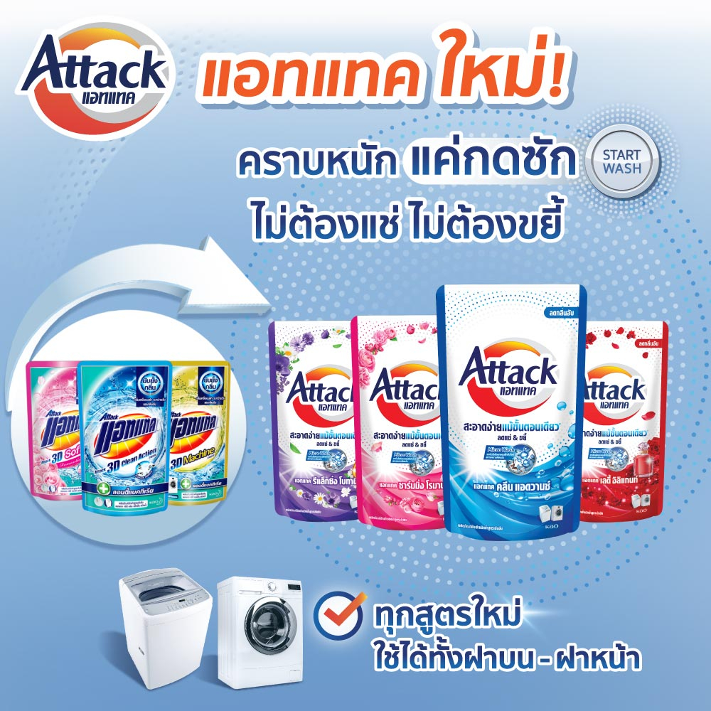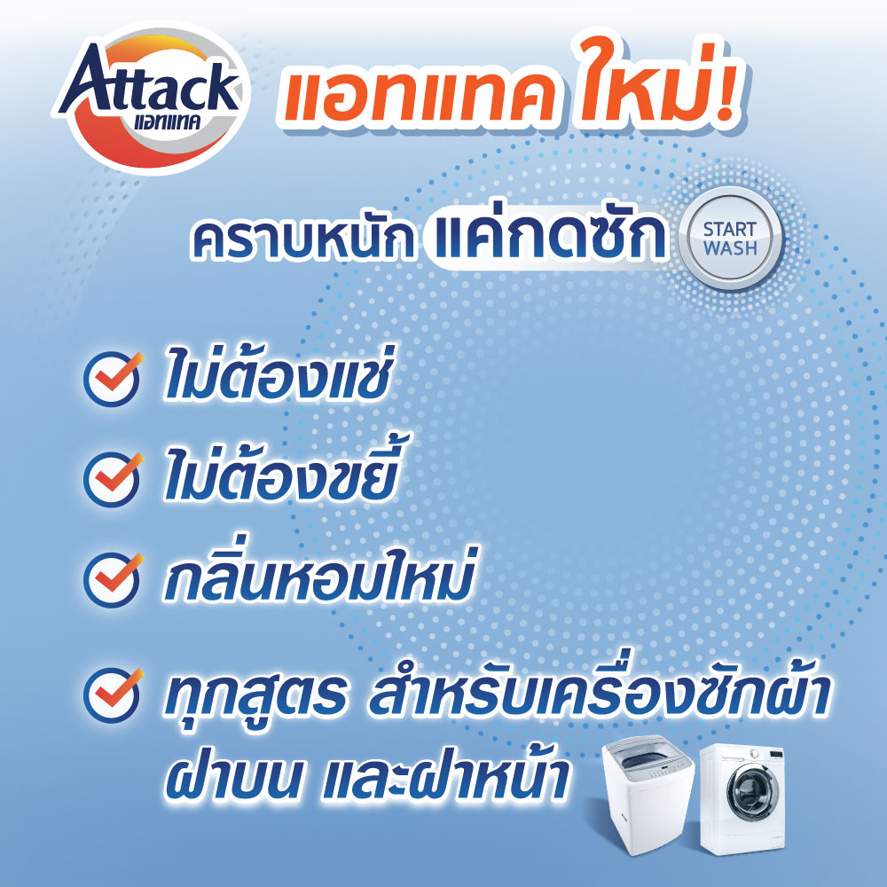 แอทแทค ใหม่! สารพัดคราบหนัก จัดการง่าย ไม่ต้องแข่ ไม่ต้องขยี้ แค่กดซัก