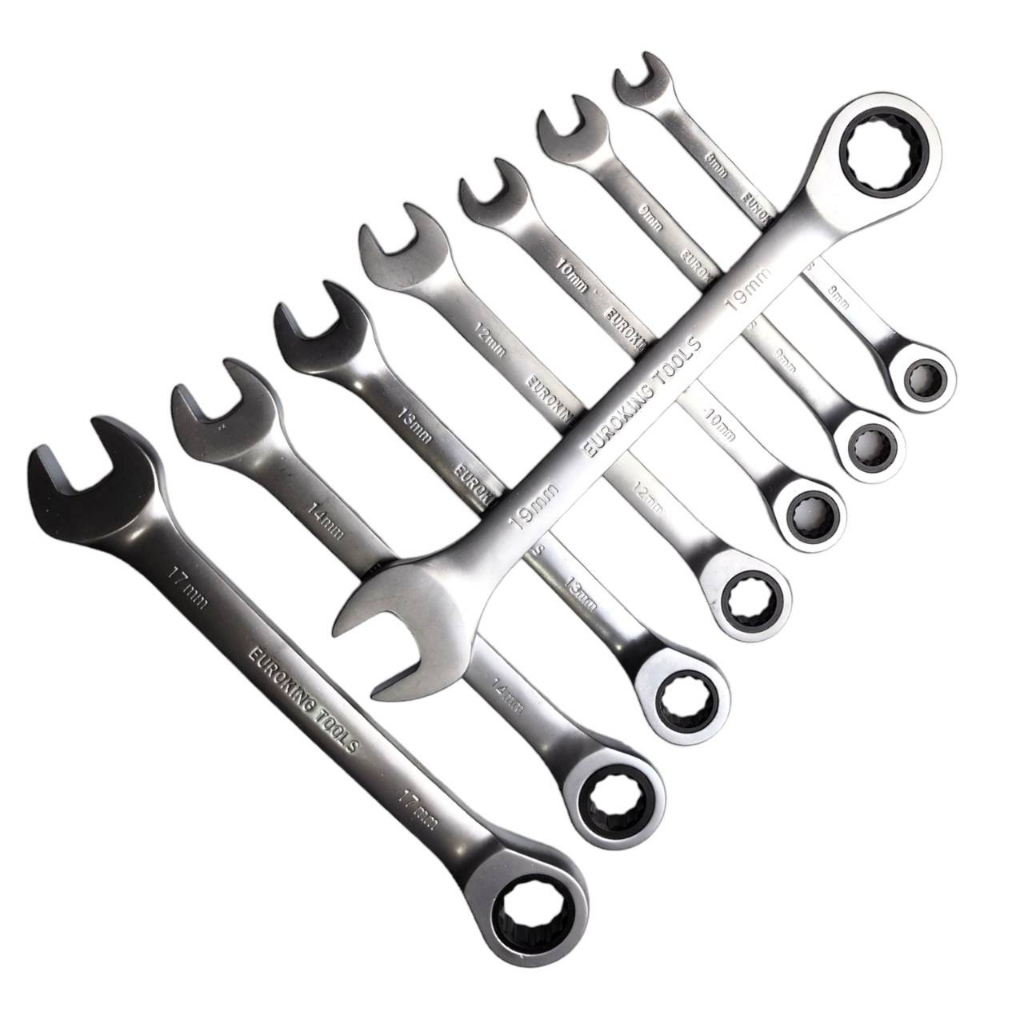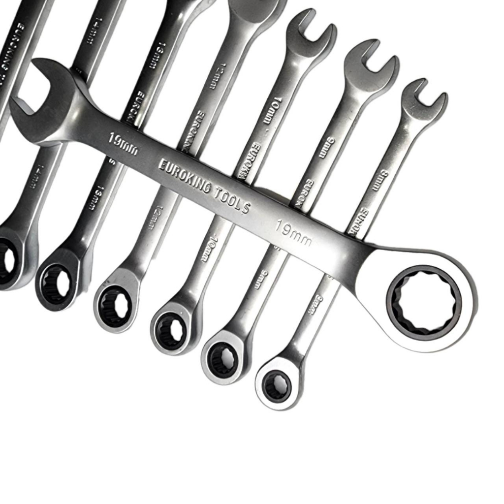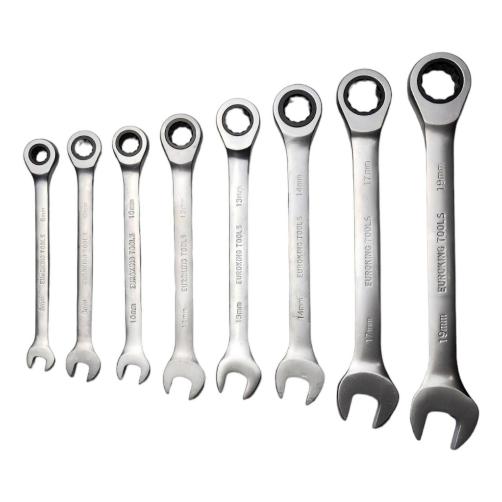 Euro King Tools ประแจแหวานข้าง ปากตาย แหวนข้างฟรี แหวนก๊อกแก๊ก เบอร์ 8-19 มม 8 ตัวชุด ชุดประแจแหวนข้างฟรี ปากตาย ขนาด 8-19 มม 8 ชิ้น ประแจขนาด 8/9/10/12/13/14/17/19 mm. ทำจากเหล็ก CR-V แข็งแรงทนทานมาตราฐาน เยอรมัน แหวนข้างแบบฟรีช่วยให้ทำงานเร็วขึ