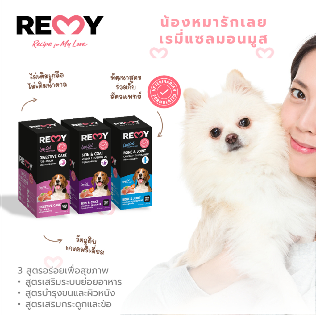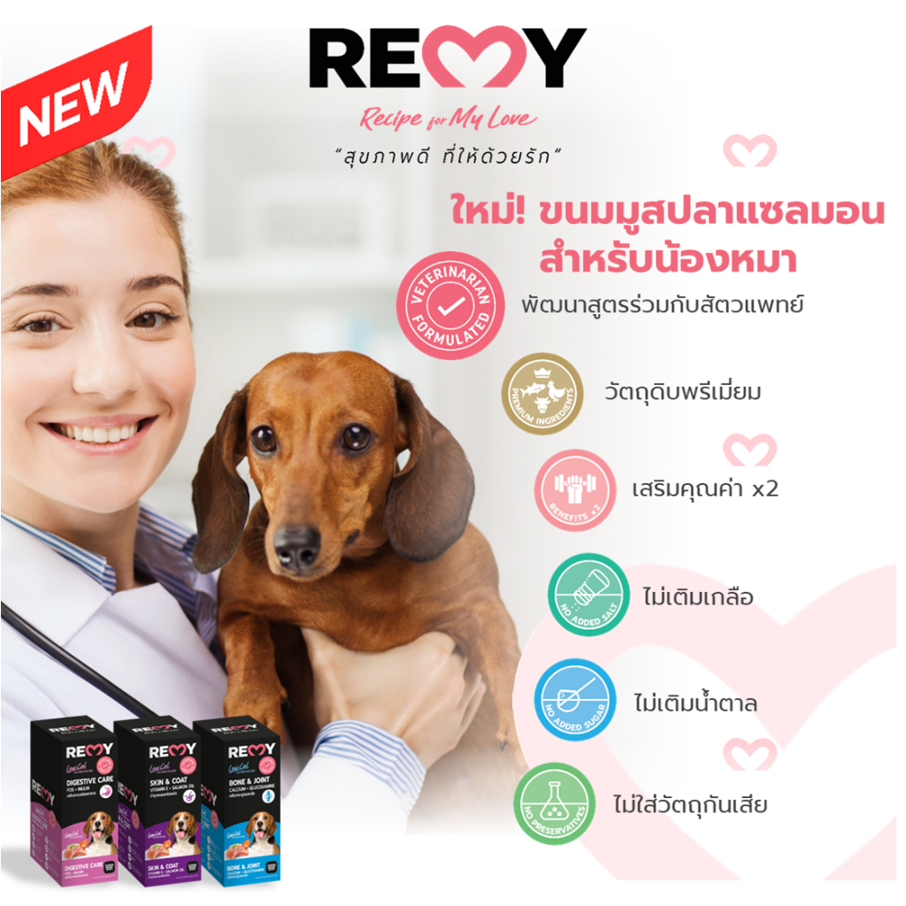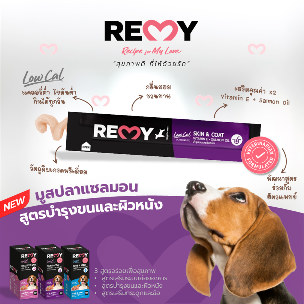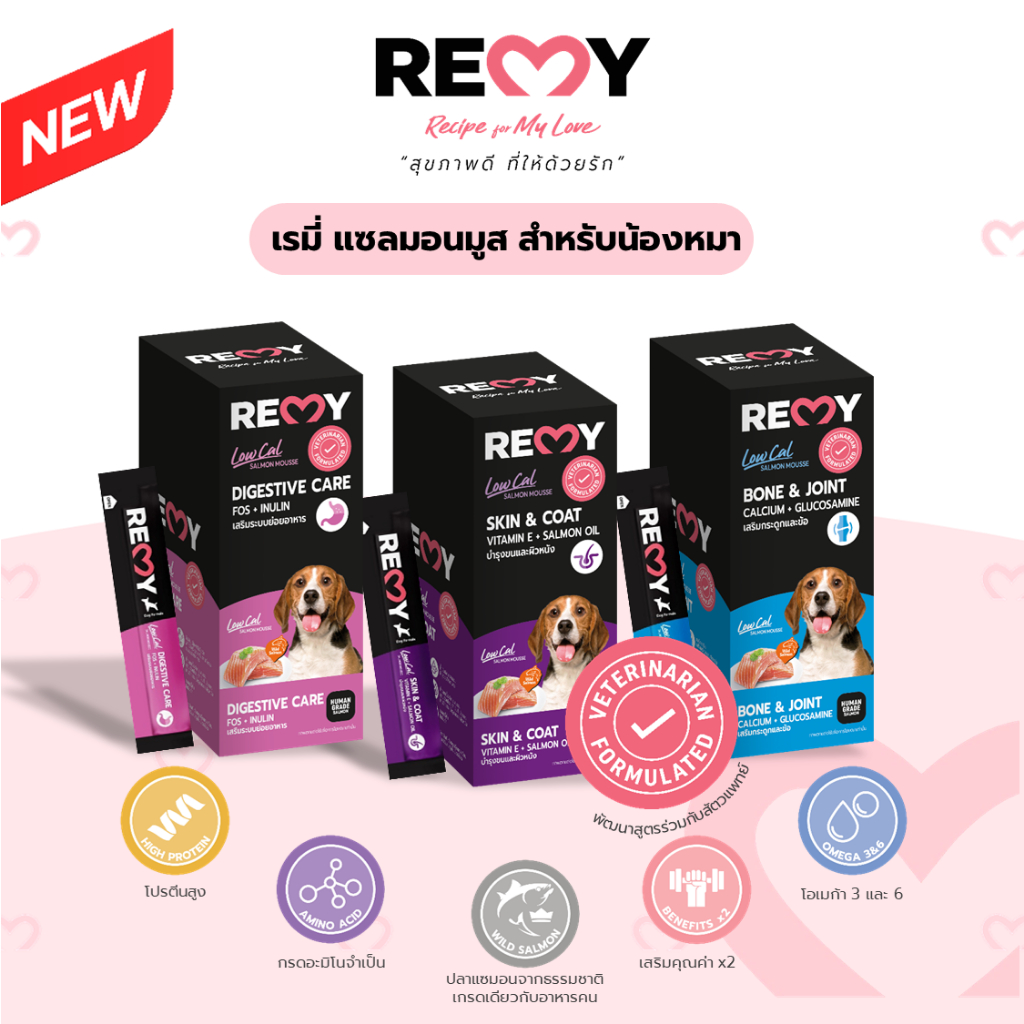 (3 แถม 1) REMY Salmon Mousse For Dog – เรมี่ แซลมอนมูสสำหรับสุนัข 1 ซองเล็ก (15g) // ยกแพ็ก จะมี 4 ชิ้น