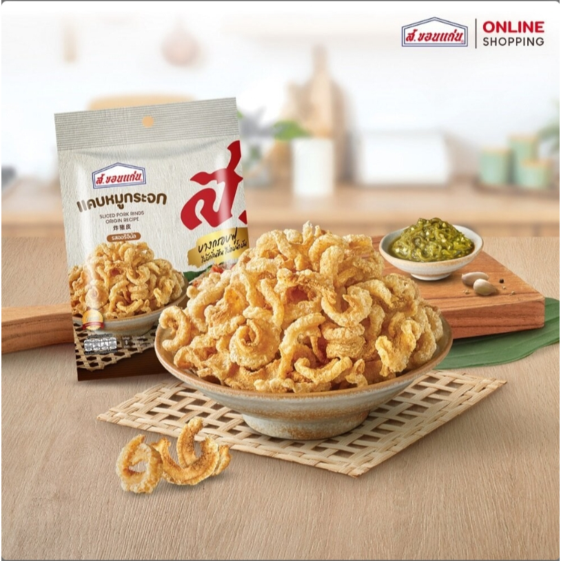 แคบหมู ส.ขอนแก่น แคบหมูสีเหลืองทอง ผ่านการบวนการทอดที่ไม่อมน้ำมัน ทำให้กรอบนาน ไม่เหม็นหืน
