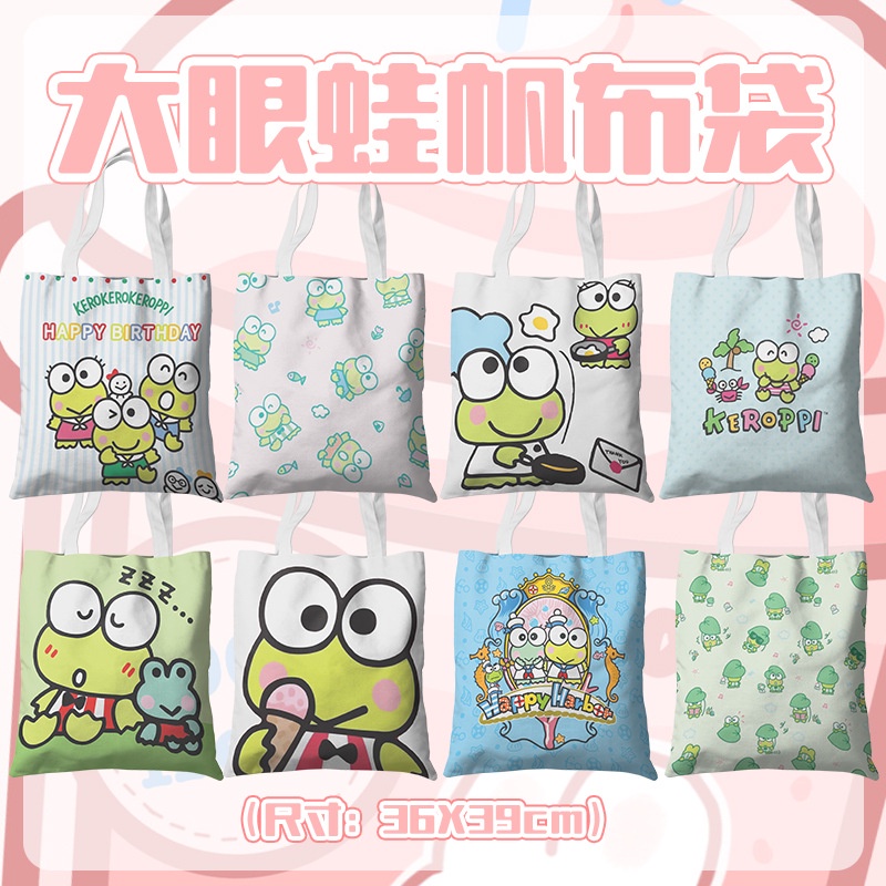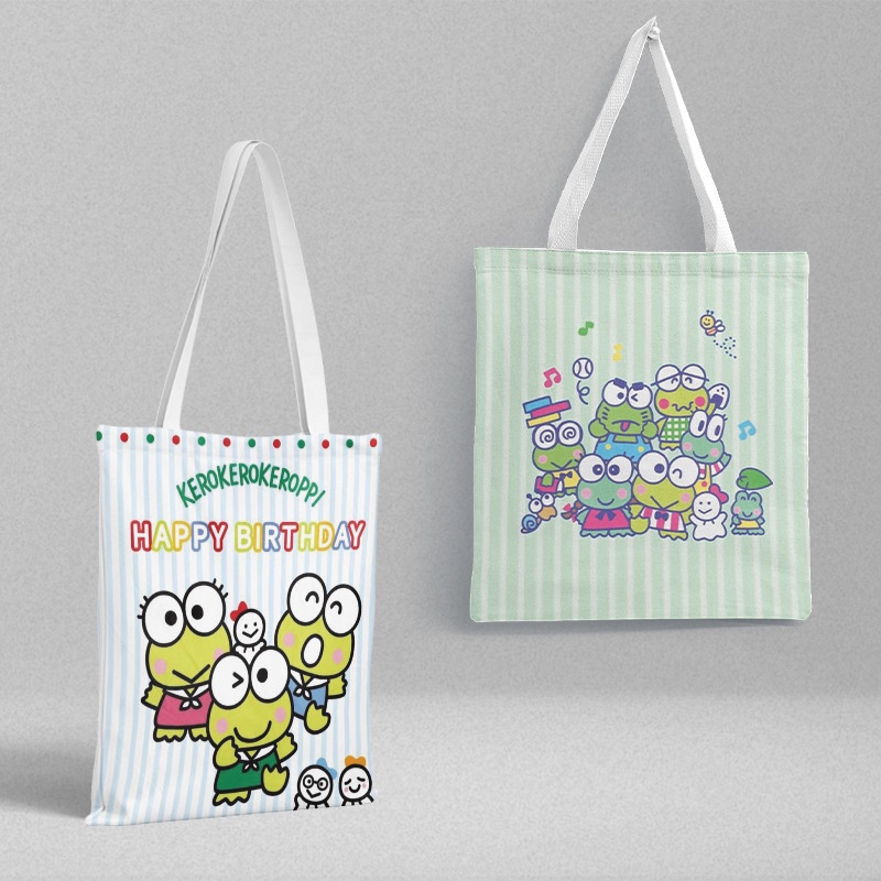 Kero Kero Keroppi กระเป๋าสะพายไหล่ กระเป๋าช้อปปิ้ง ผ้าแคนวาส แบบหนา พิมพ์ลายการ์ตูนน่ารัก สองด้าน สําหรับนักเรียน