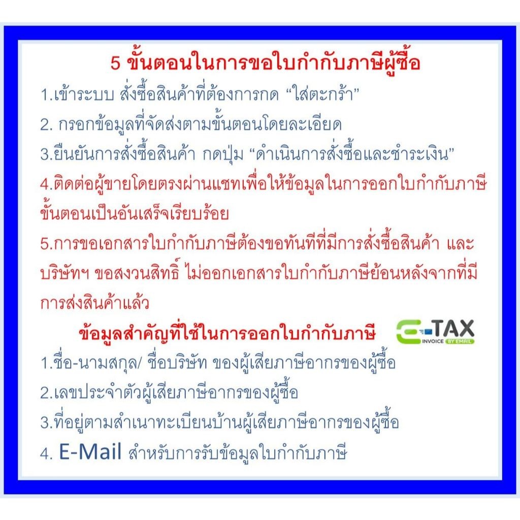 * ลูกค้าท่านใด ต้องการใบกำกับภาษี รบกวนแจ้งข้อมูลในช่องหมายเหตุสั่งซื้อก่อนกดชำระเงิน
