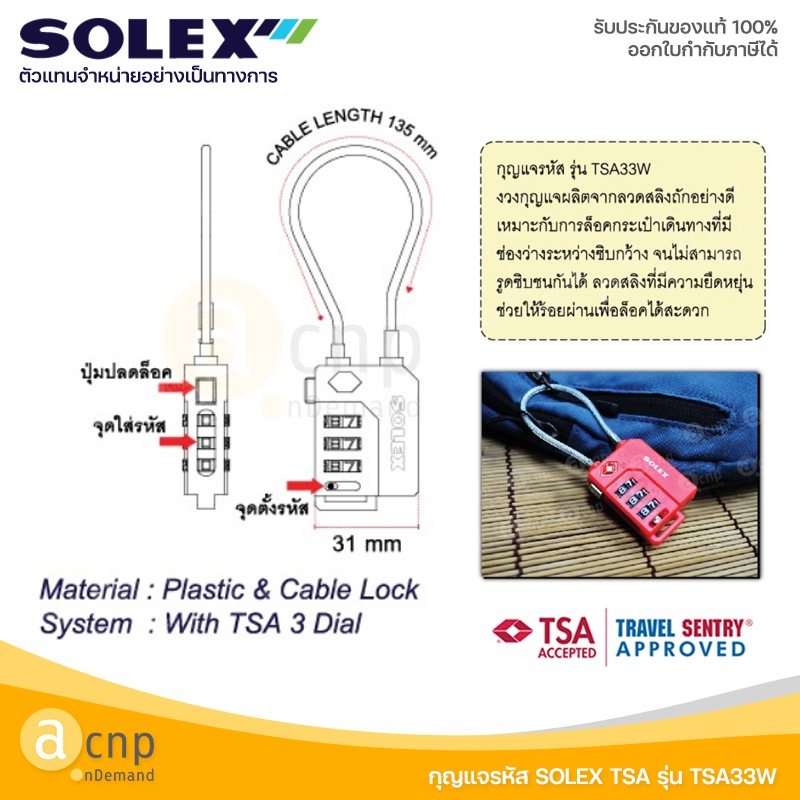 กุญแจรหัส SOLEX Travel Lock ทีเอสเอ TSA รุ่น TSA33W รหัส 3 หลัก มาตรฐาน TSA Combination Lock คือระบบกุญแจมาตรฐานสากล ที่มีไว้สำหรับเจ้าหน้าที่ตรวจคนเข้าเมือง (ตม.) หากตรวจพบสิ่งของต้องห้ามขึ้นเครื่อง เจ้าหน้าที่ (ตม.)สามารถใช้กุญแจพิเศษ สำหรับไขเปิดตรวจสอ