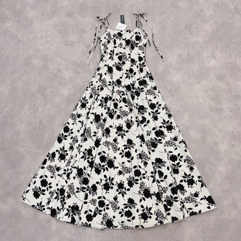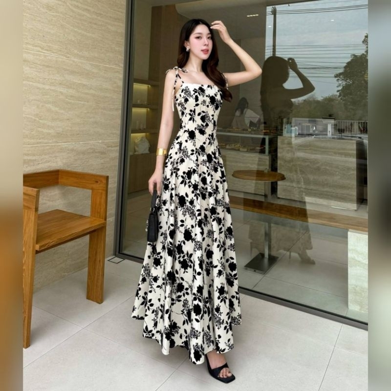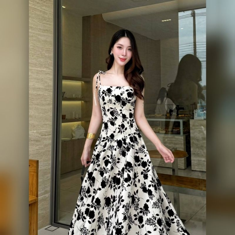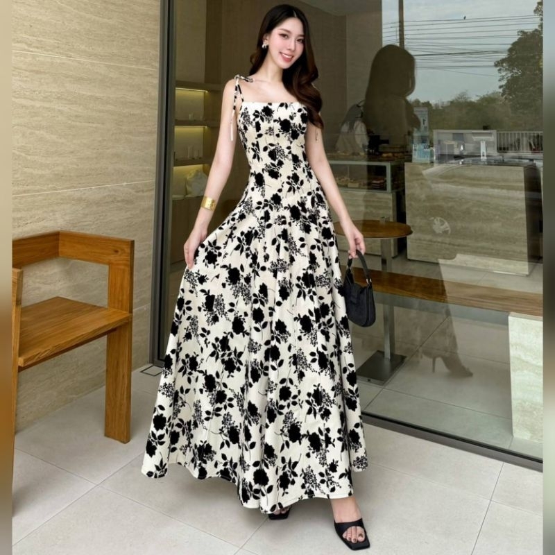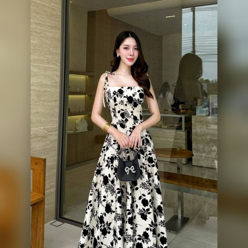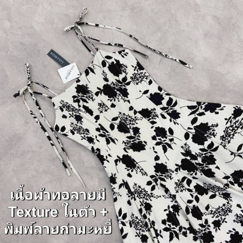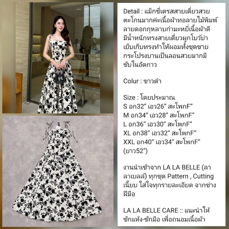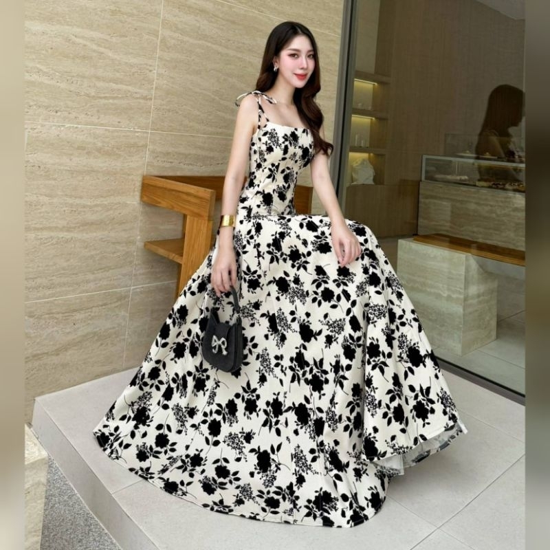 Lalabelle แท้?ตรงปก✨ร้านนี้มีพร้อมส่งเลย✅*ส่งไว? เดรสยาว แมกซี่เดรสลายดอกกุหลาบกำมะหยี่ ชุดออกงานสี ขาว ดำ