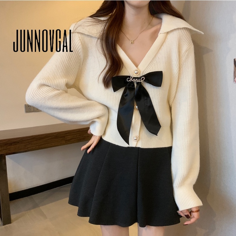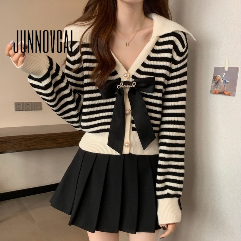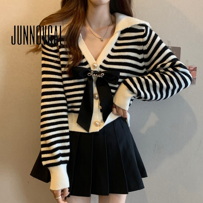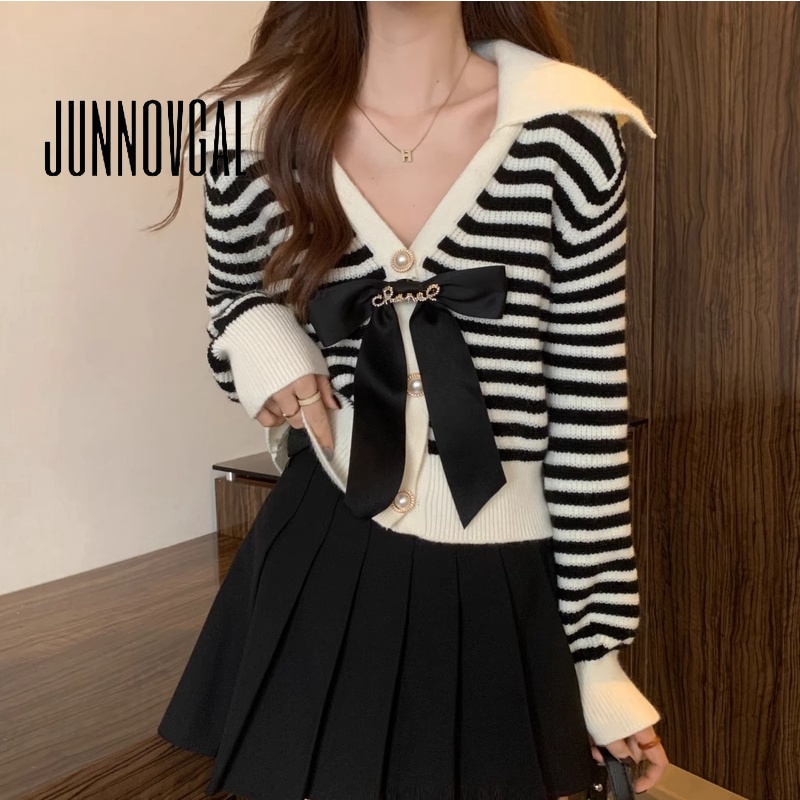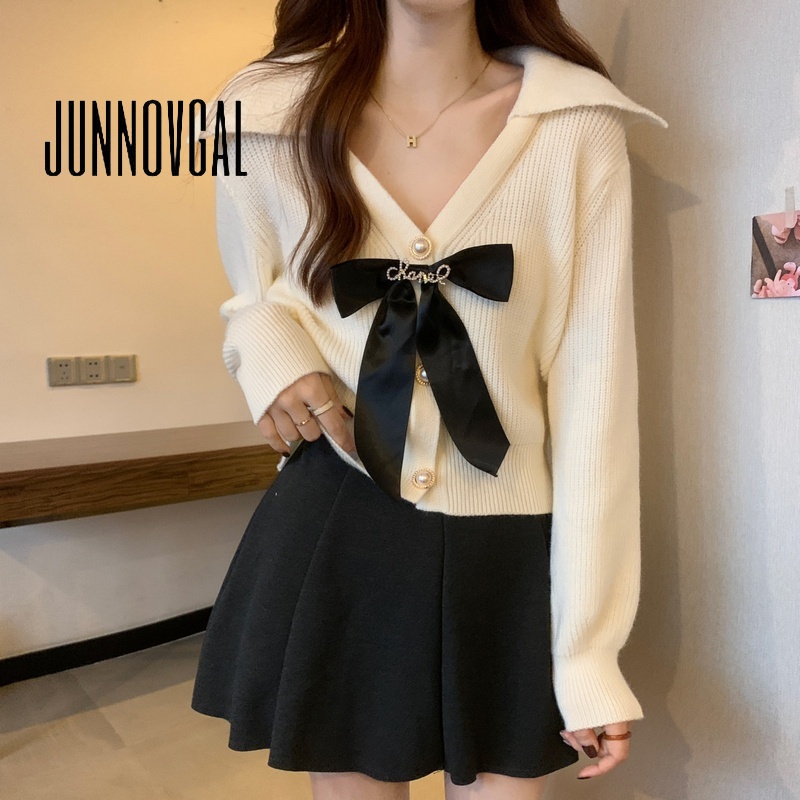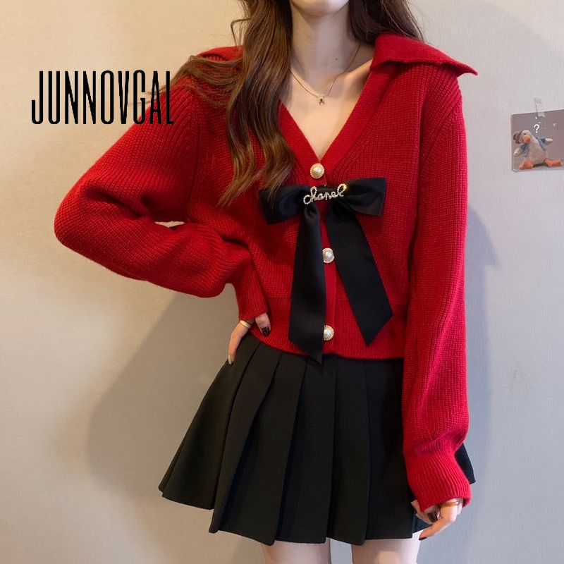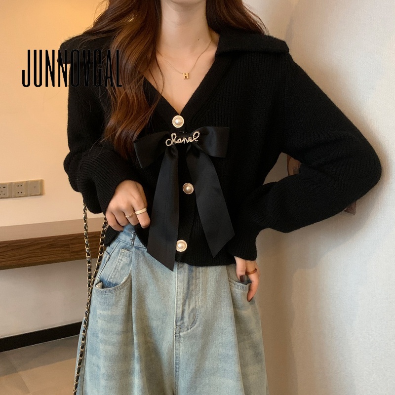 JUNNOVGAL เสื้อคาร์ดิแกนผู้หญิงสีทึบคอวี Bowknot Casual สไตล์ใหม่ Slim Fit แขนยาว