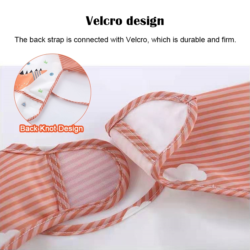 - ขนาดฟรีไซส์ สำหรับเด็กอายุ 0-5 ปี สวมใส่ง่าย แปะติดกันด้านหลังคอ และมีสายผูกที่เอว