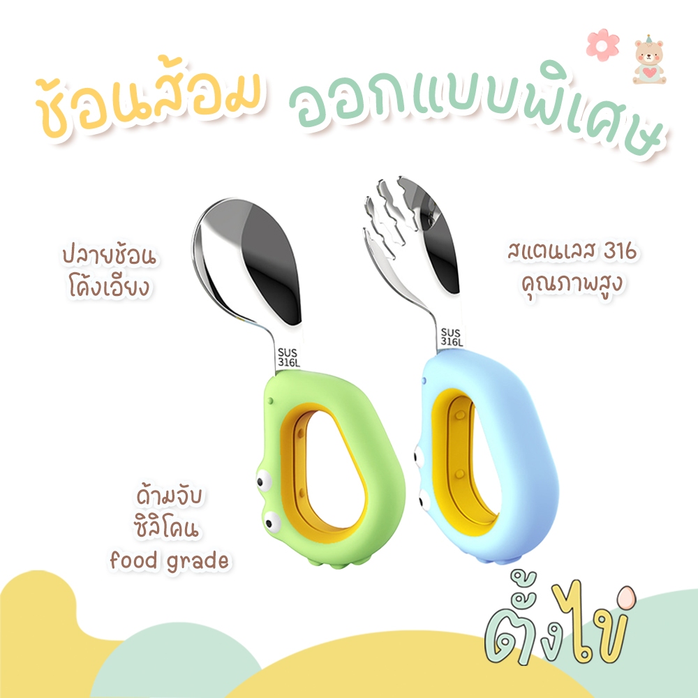 [ตั้งไข่] ช้อนส้อมซิลิโคนด้ามคล้อง ปลายสแตนเลสโค้ง ลายจระเข้น่ารัก พร้อมกล่องเก็บ