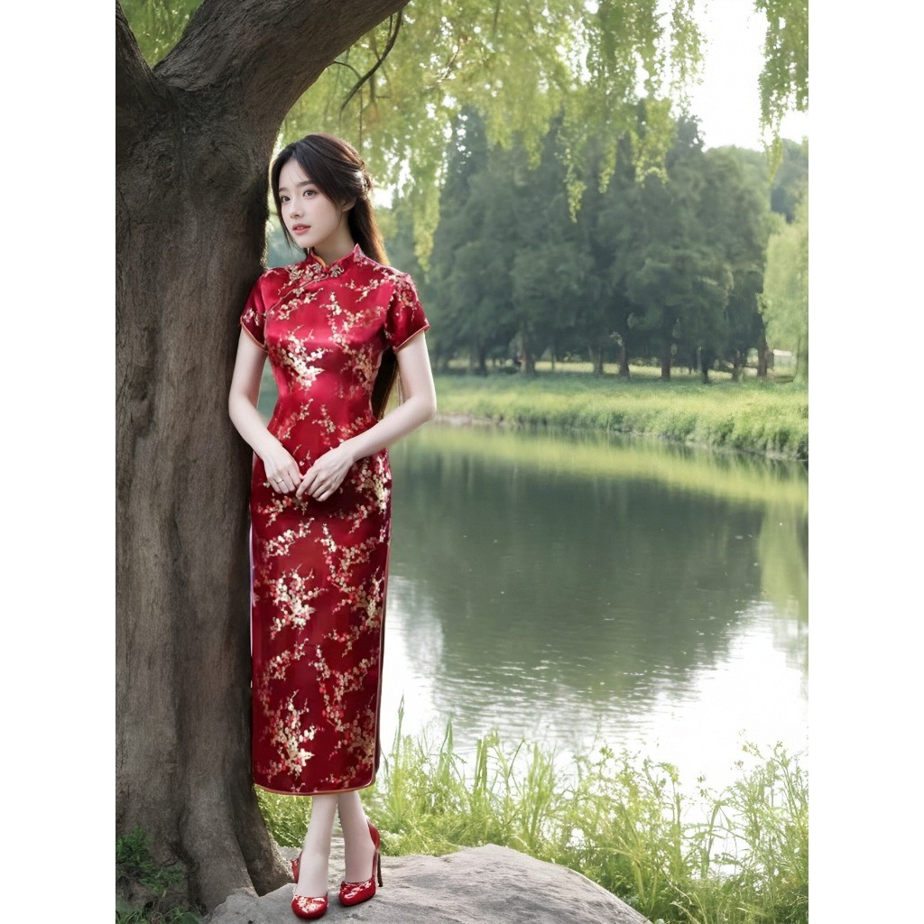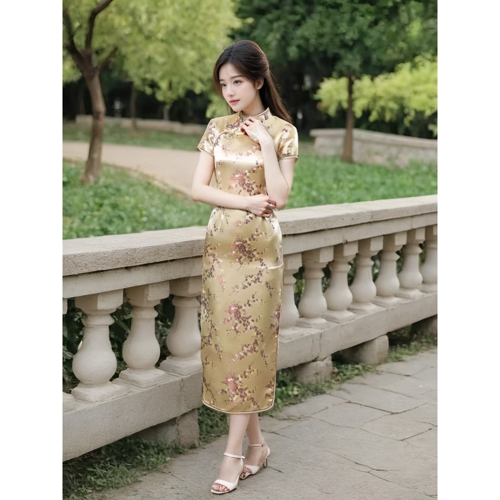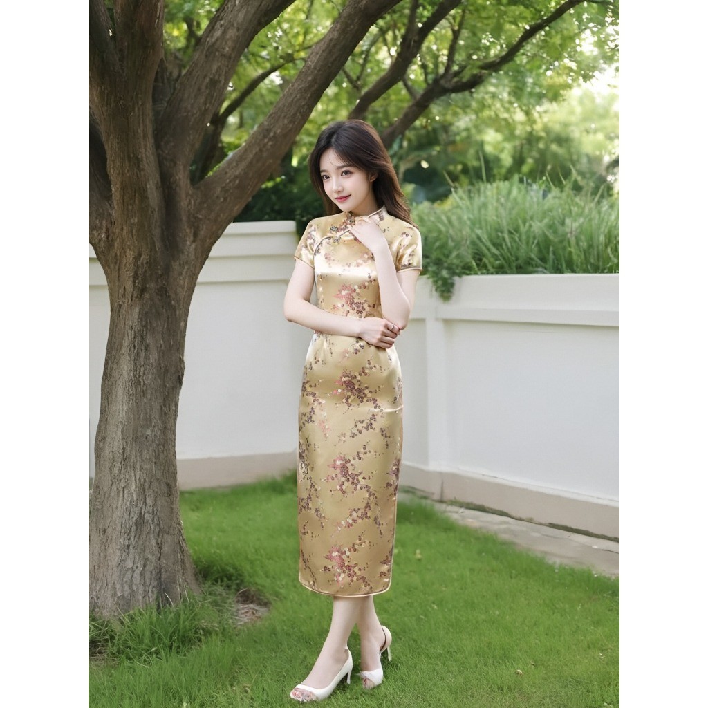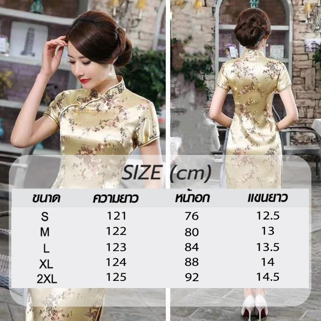 ชุดเดรสกี่เพ้าลายดอกเหมยสีสดใสสุดๆ ผ่าข้างเพิ่มลุคเซ็กซี่และน่ารักสำหรับสาวๆ
