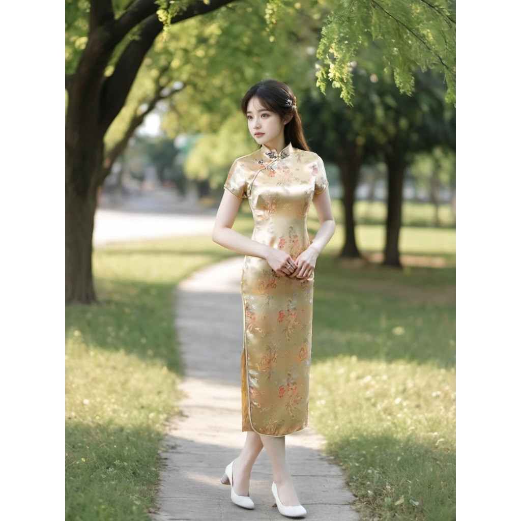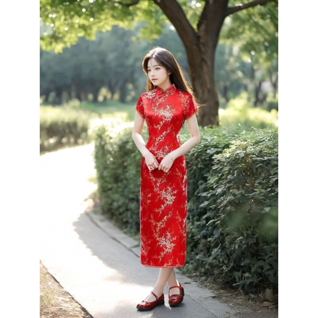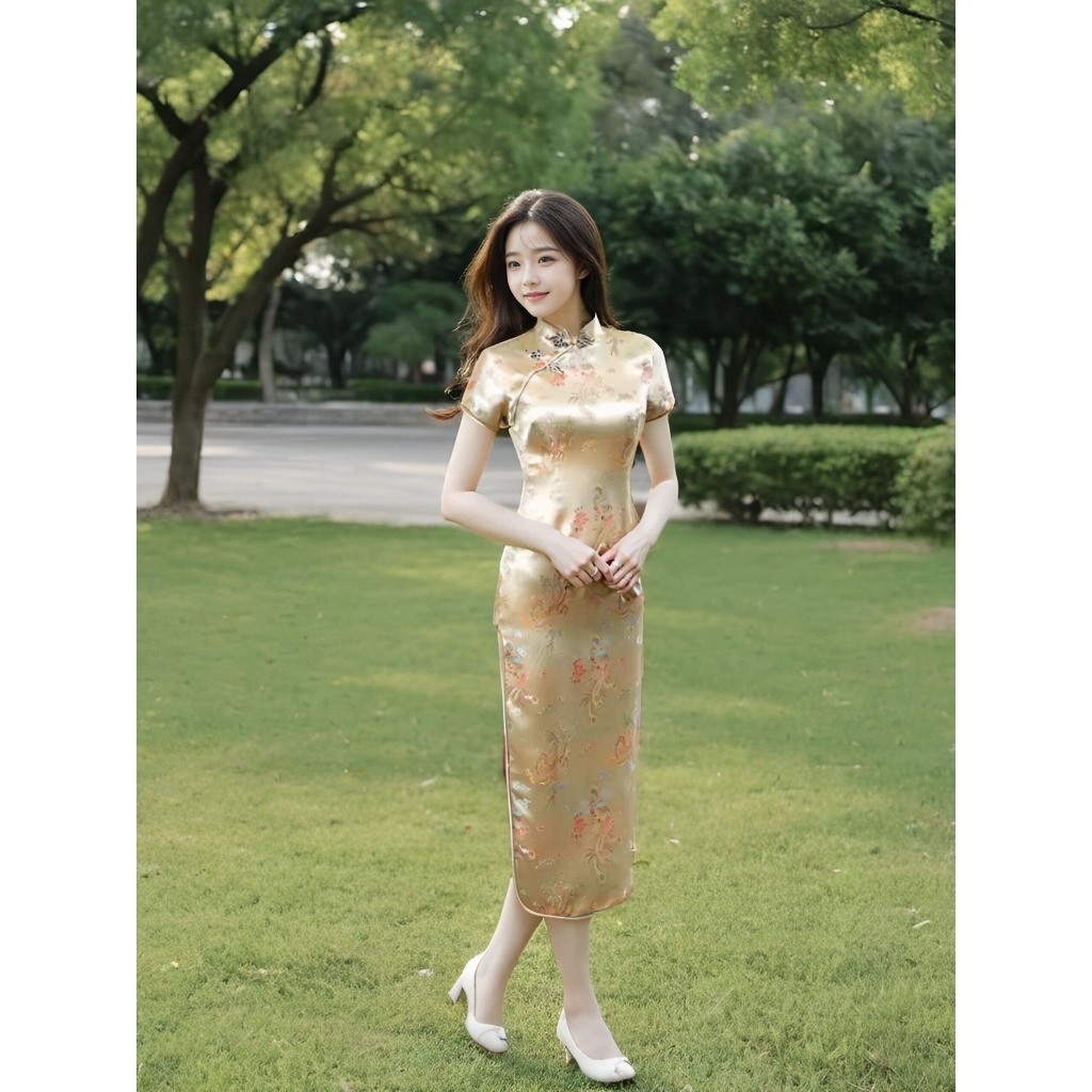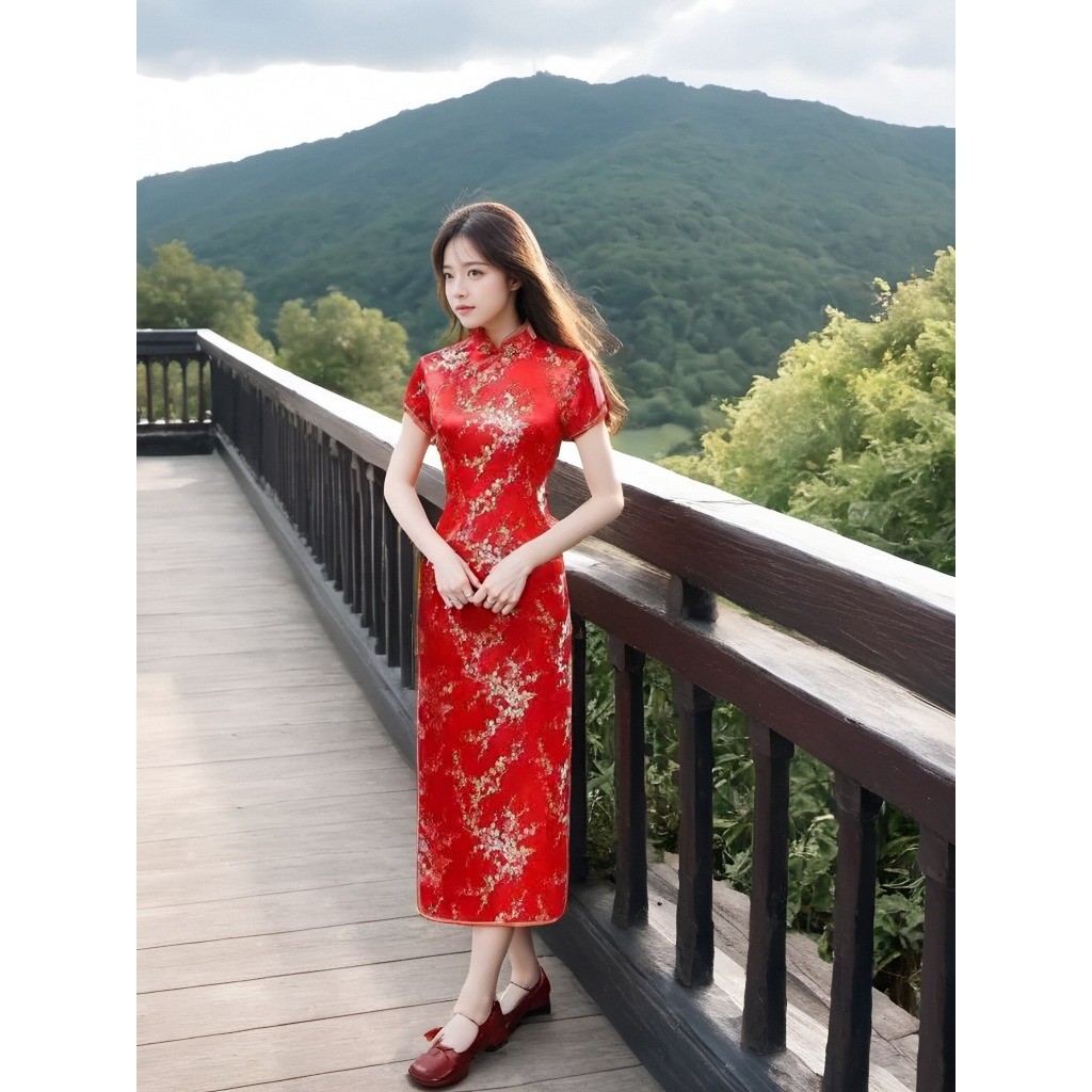 ชุดเดรสกี่เพ้าลายดอกเหมยสีสดใสสุดๆ ผ่าข้างเพิ่มลุคเซ็กซี่และน่ารักสำหรับสาวๆ