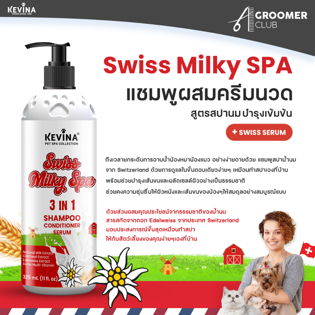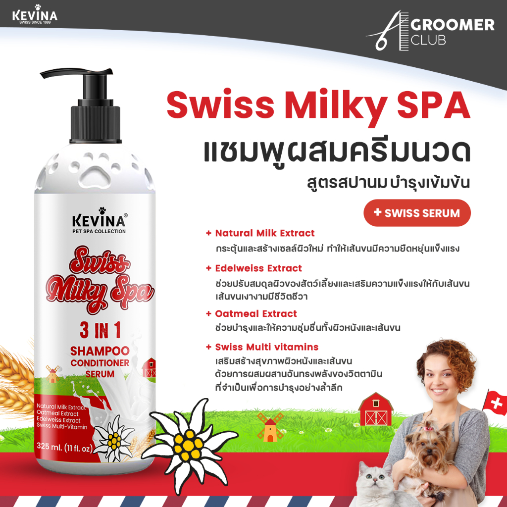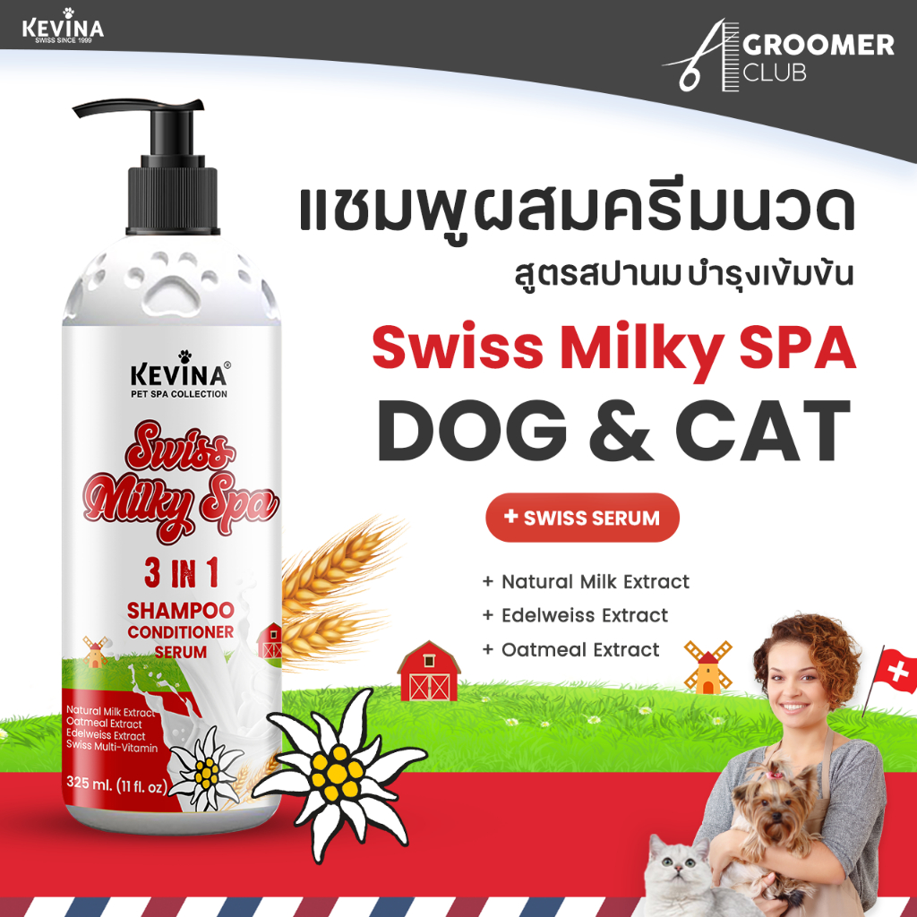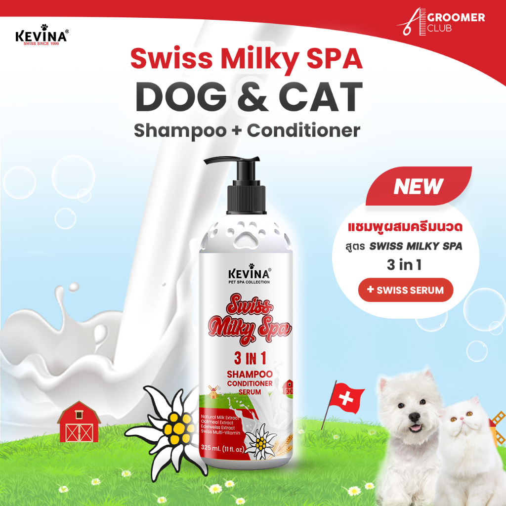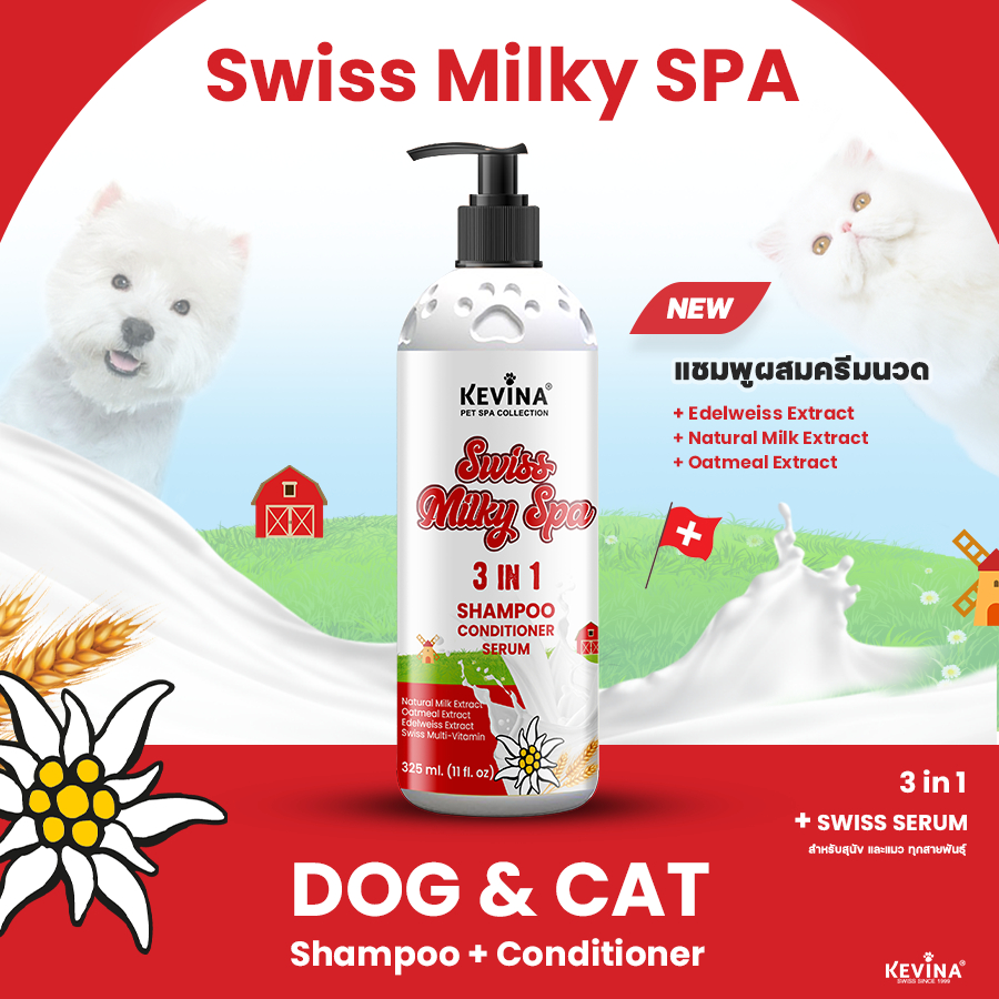 ใหม่ แชมพูผสมครีมนวดสุนัขและแมว KEVINA สูตร Swiss Milky SPA ขนาด 325 ml