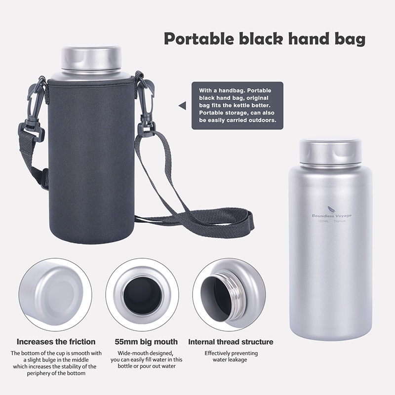 คุณสมบัติ: 1. ไทเทเนียมเกรดพรีเมี่ยมทำจากไทเทเนียมเกรดพรีเมี่ยมมีน้ำหนักเบาทนทานและแข็งแรง ไทเทเนียมไม่ทำปฏิกิริยากับเครื่องดื่มไม่มีโลหะหนักตกตะกอนและคงรสชาติของเครื่องดื่มไว้ 2. ความจุ 1 ลิตรสามารถตอบสนองความต้องการของน้ำดื่มกลางแจ้ง น้ำหนักเบาและทนต่อ