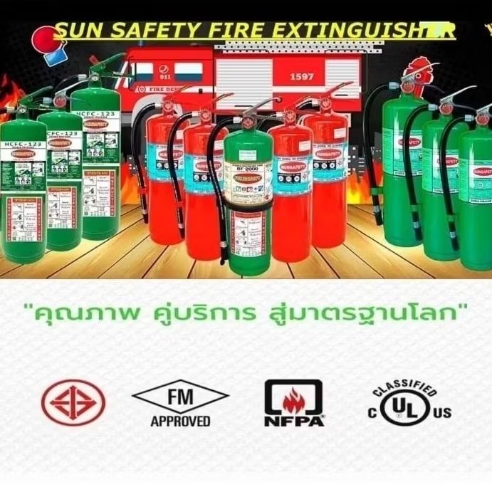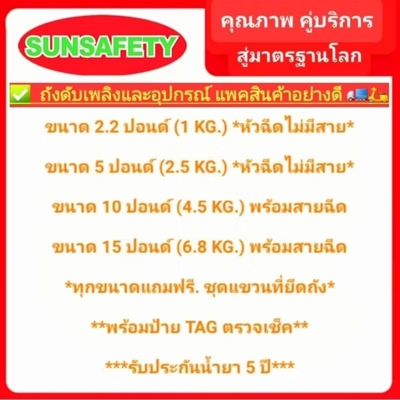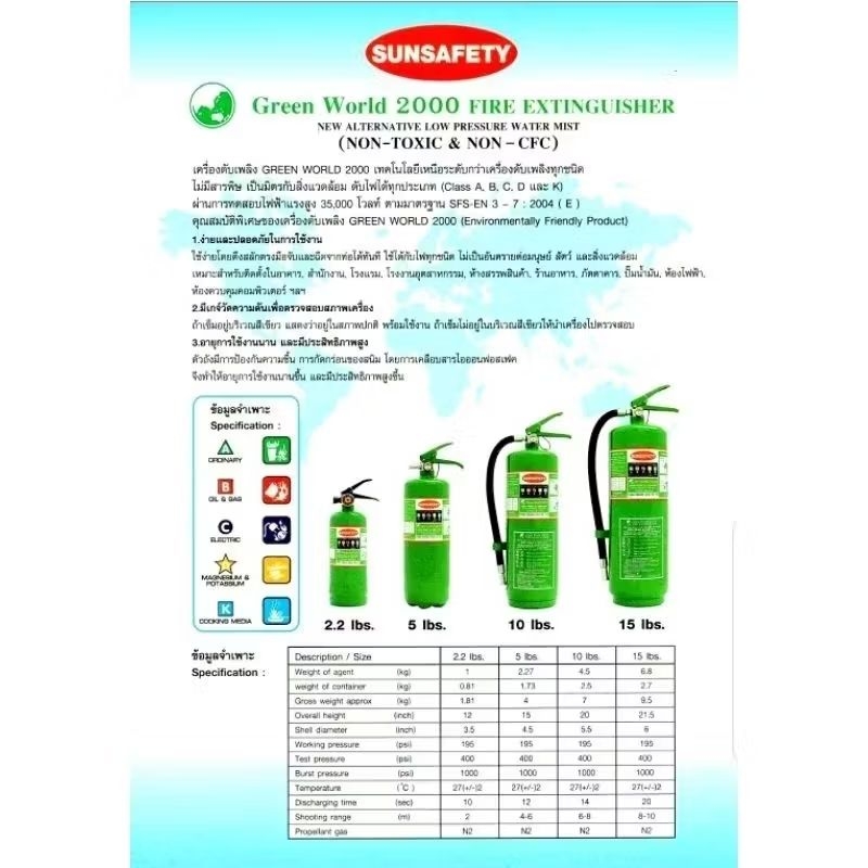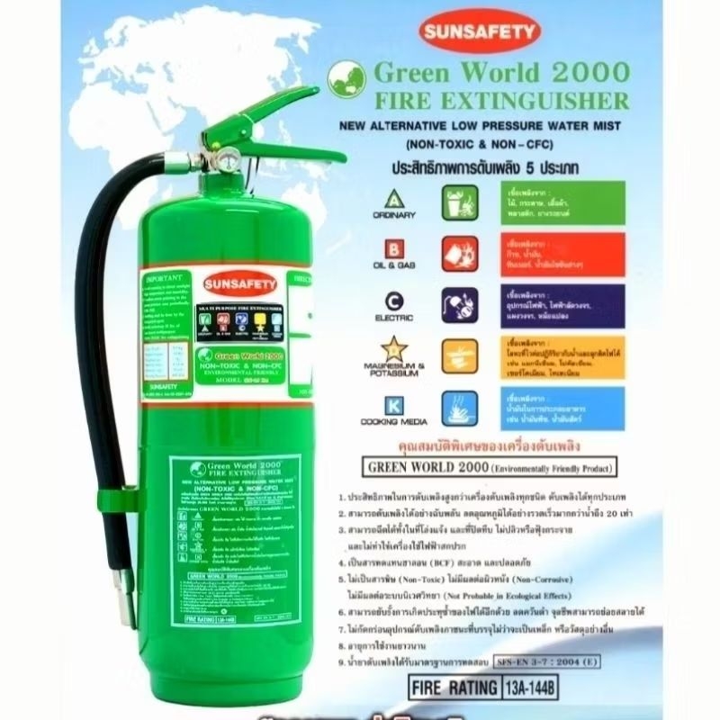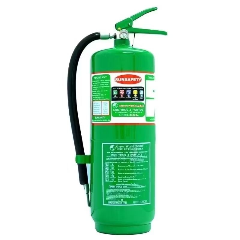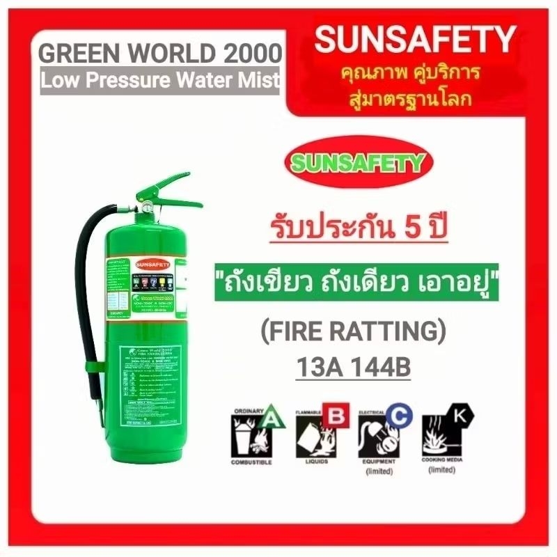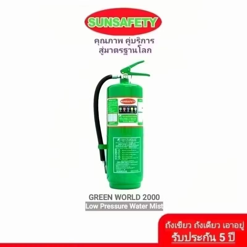 SUNSAFETY ถังดับเพลิงสีเขียว GREEN WORLD 2000 (NON CFC) ชนิดเคมีน้ำสูตรแรงดันต่ำ Low Pressure Water Mist รับประกัน 5 ปี.