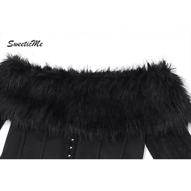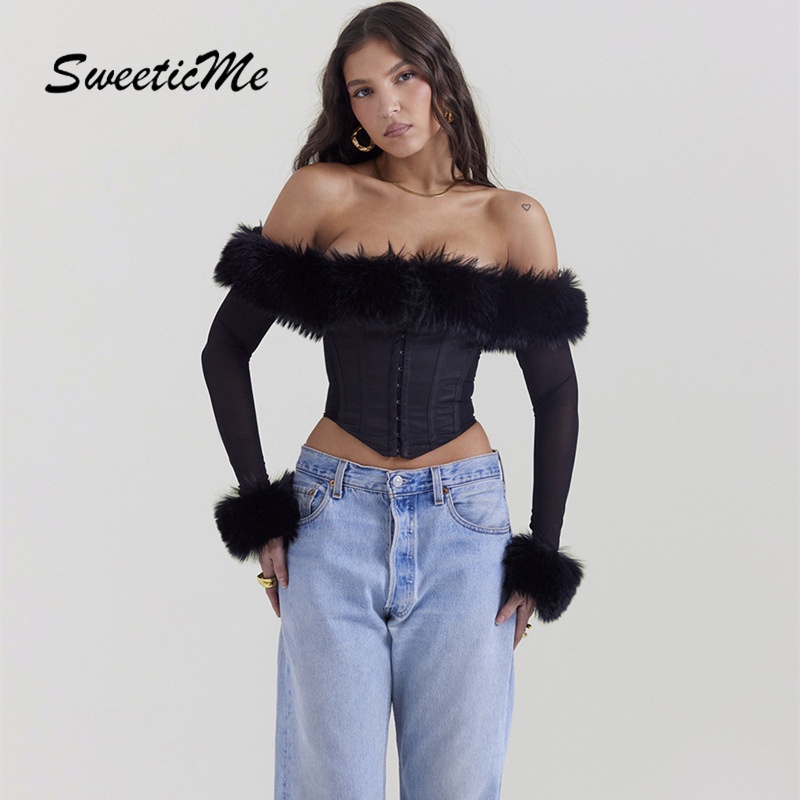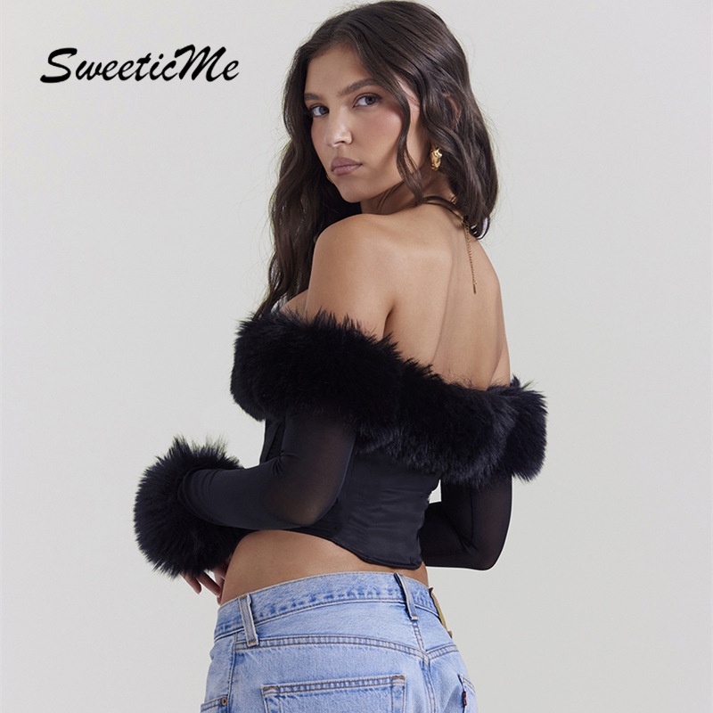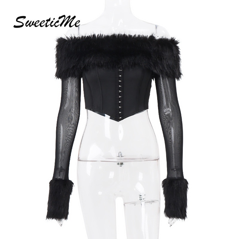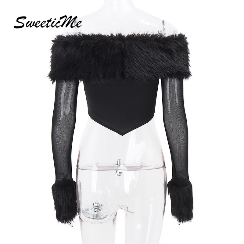 SweeticMe แฟชั่นผู้หญิงใหม่เซ็กซี่ปิดไหล่แขนยาวตาข่ายทุกการแข่งขันไม่สม่ําเสมอด้านบน