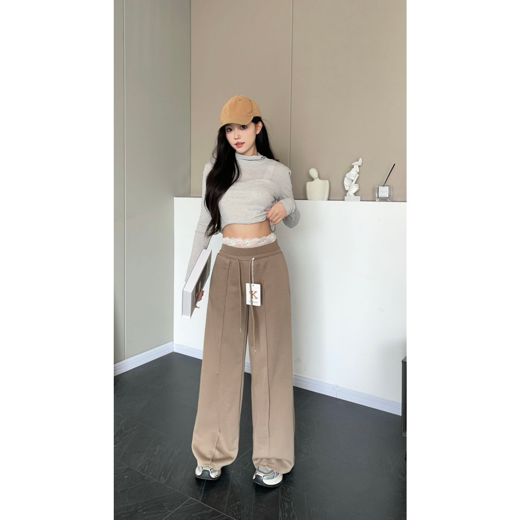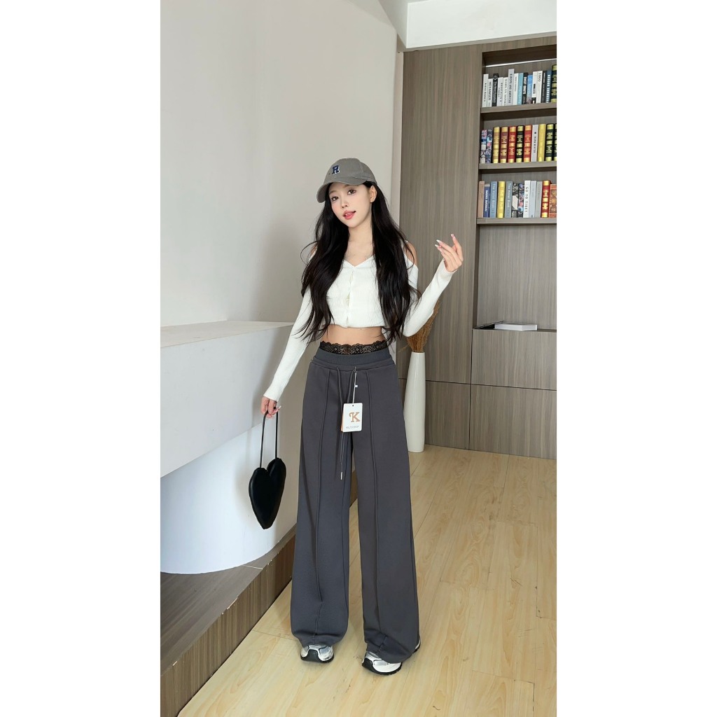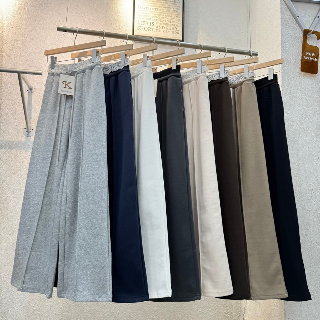 Reallyshops #1067(K) กางเกงขายาวทรงกระบอก แต่งเอวลูกไม้ เอวยางยืด ผู้หญิง พร้อมส่ง