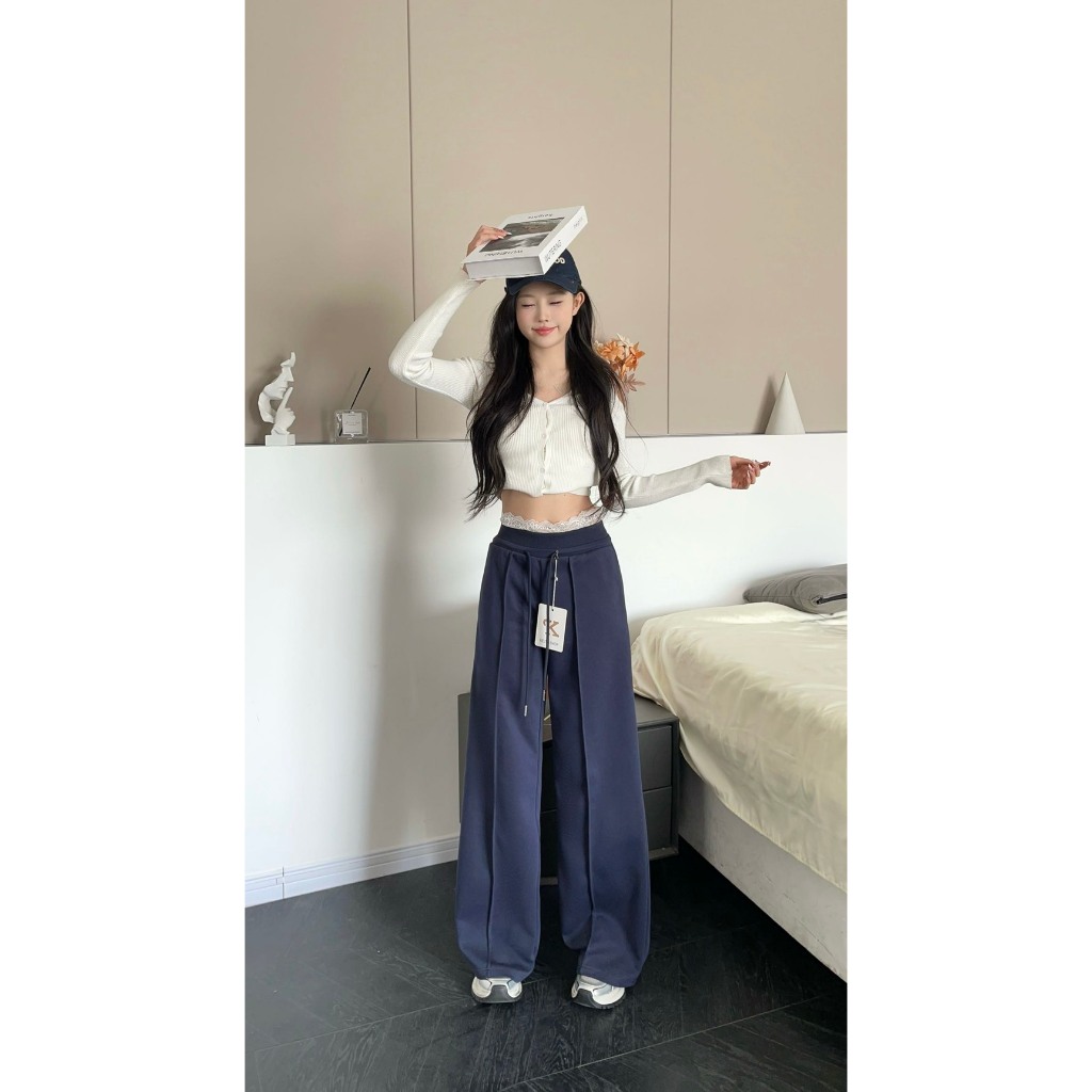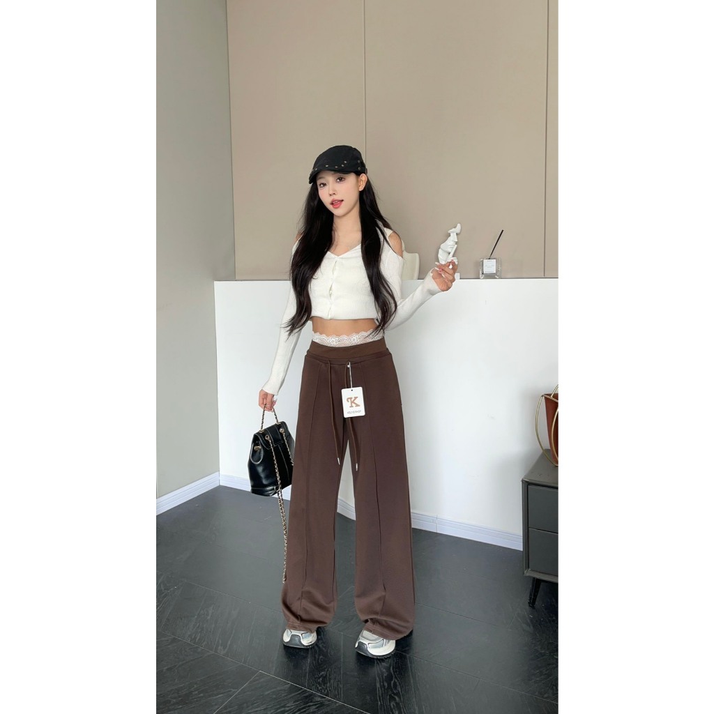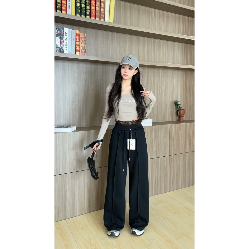 Reallyshops #1067(K) กางเกงขายาวทรงกระบอก แต่งเอวลูกไม้ เอวยางยืด ผู้หญิง พร้อมส่ง