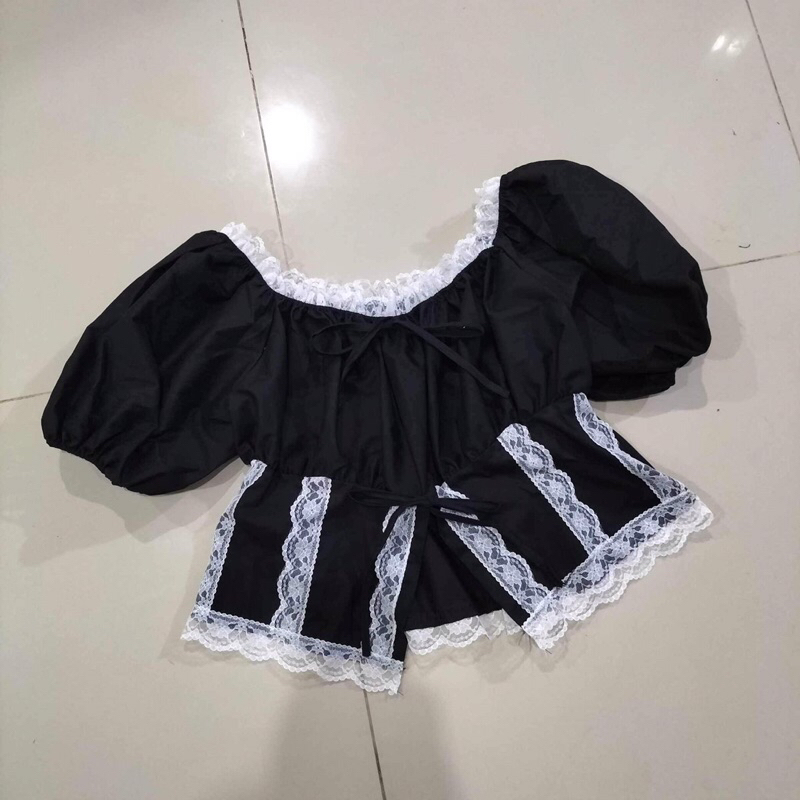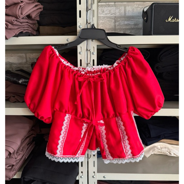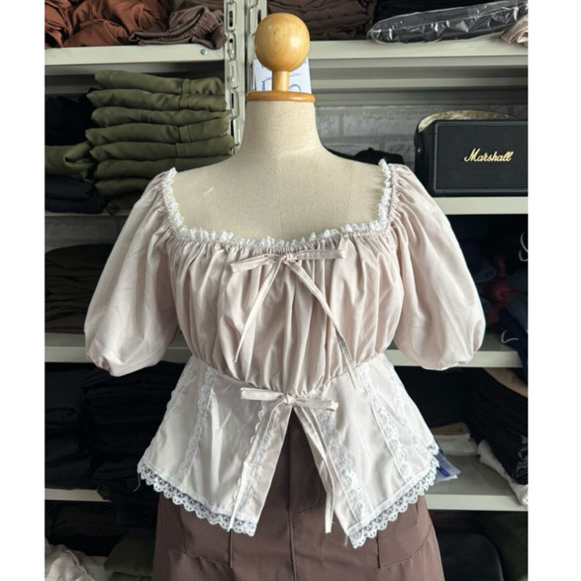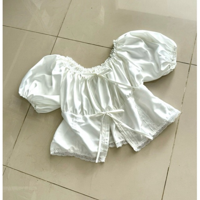 เสื้อปาดไหล่แขนตุ๊กตาแต่งลูกไม้สีขาว