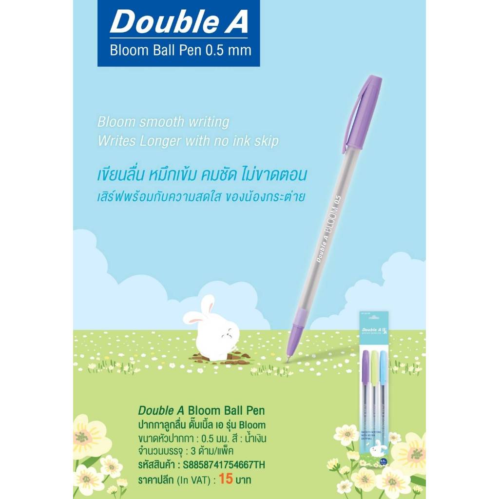 ปากกาลูกลื่น ดั๊บเบิ้ล เอ Bloom Ball 0.5 มม. (สีน้ำเงิน) แพ็ค 3 ด้าม