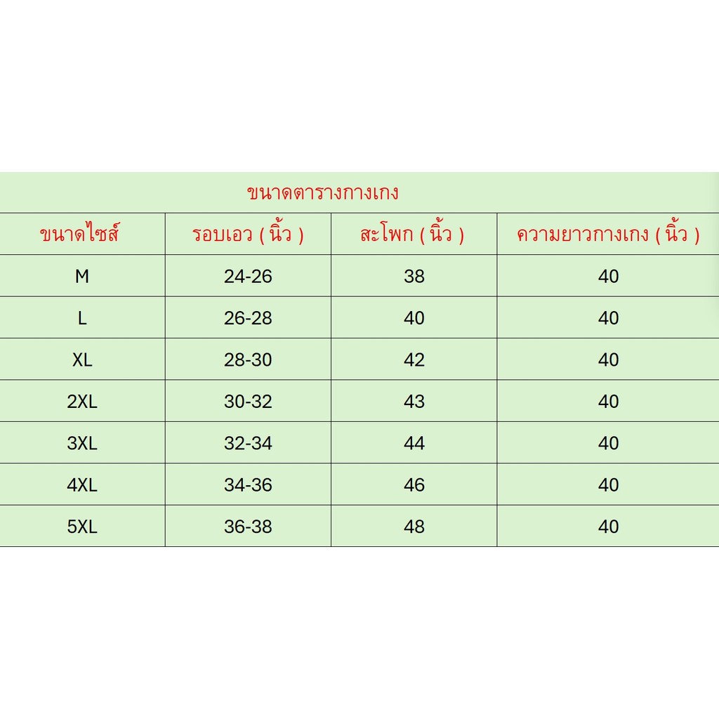 M เอว 24-26นิ้ว สะโพก 38 นิ้ว รอบต้นขา 20 นิ้ว รอบปลายขา 15 นิ้ว กางเกงยาว 40 นิ้ว