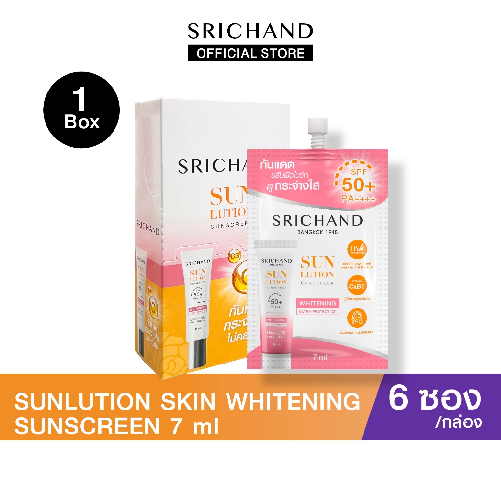 [6pcs/Box]SRICHAND ศรีจันทร์กันแดดสกินแคร์ สูตรผิวขาวกระจ่างใส ซันลูชั่น สกิน ไวท์เทนนิ่ง ซันสกรีน SPF50+ PA++++