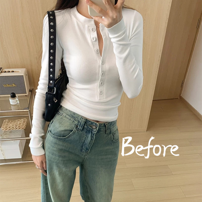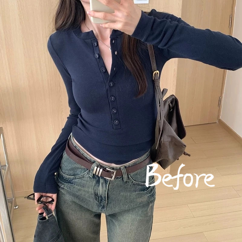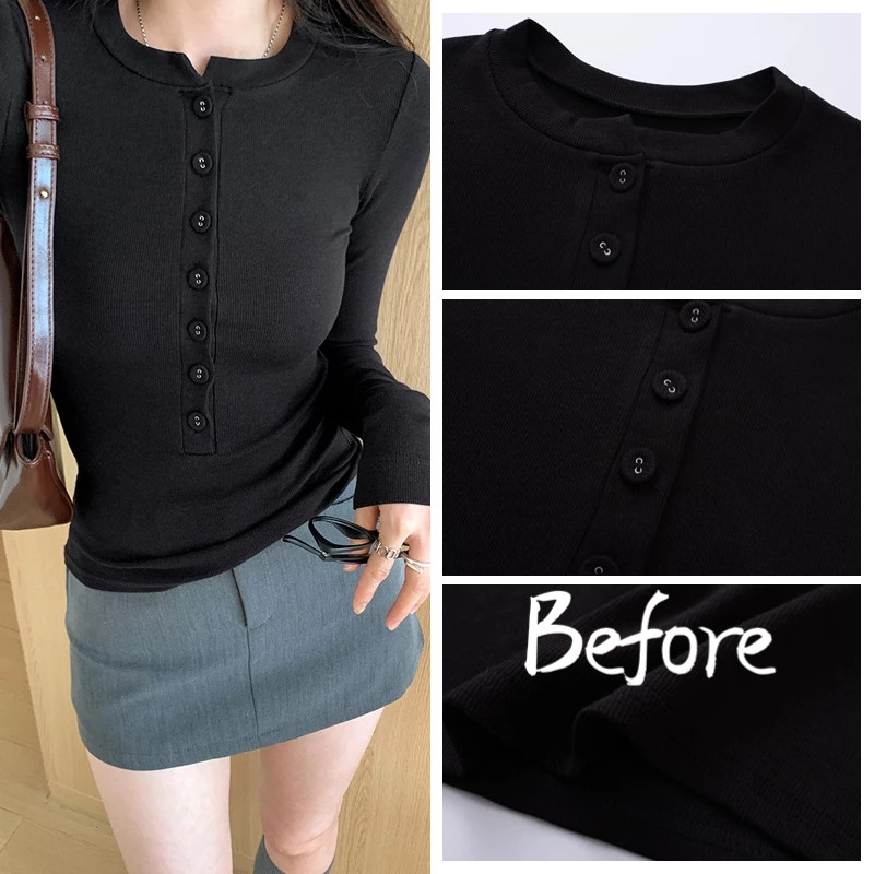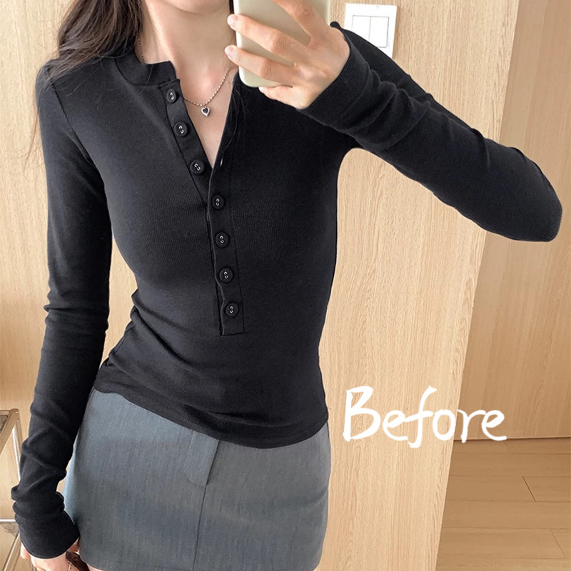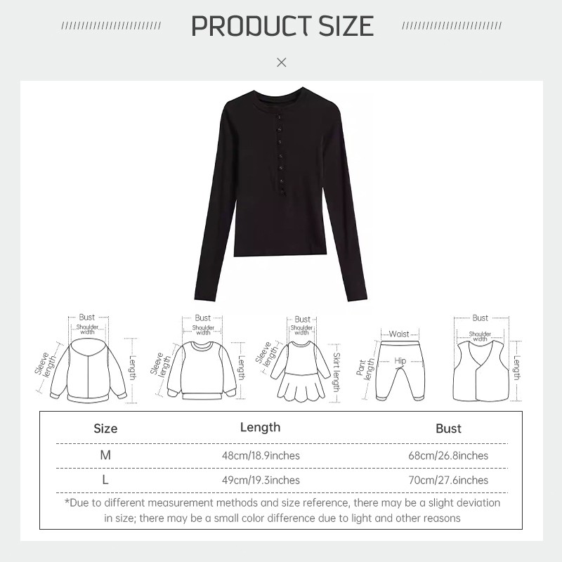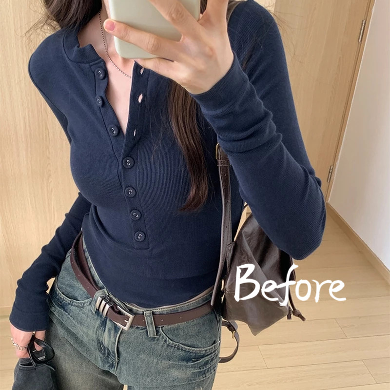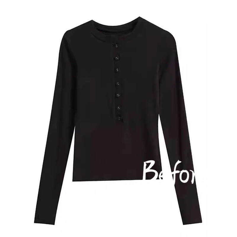 ฤดูใบไม้ร่วงรูปแบบใหม่ กระดุมแถวเดียวของผู้หญิง แขนยาวสีทึบ เสื้อยืดเซ็กซี่ BF