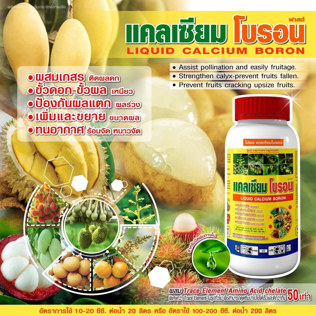 อ็อกซิน ไซโต : ผสมเกสร ผสมเทียม ก่อนดอกบาน  ติดผลดก ดอกผลสมบูรณ์ ขั้วดอก ขั้วผลเหนียว  ขยายผลอ่อน ทนอากาศ ร้อนจัด หนาวจัด อัตราการใช้ 20-30 ซีซี ต่อน้ำ 20 ลิตร หรือ 200-300 ซีซี ต่อน้ำ 200 ลิตร แคลเซียมโบรอน (ฉลากเหลือง) : ผสมเกสร ติดผลดก ขั้วดอก ขั้วผล