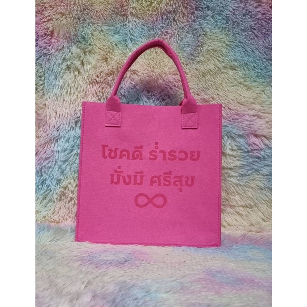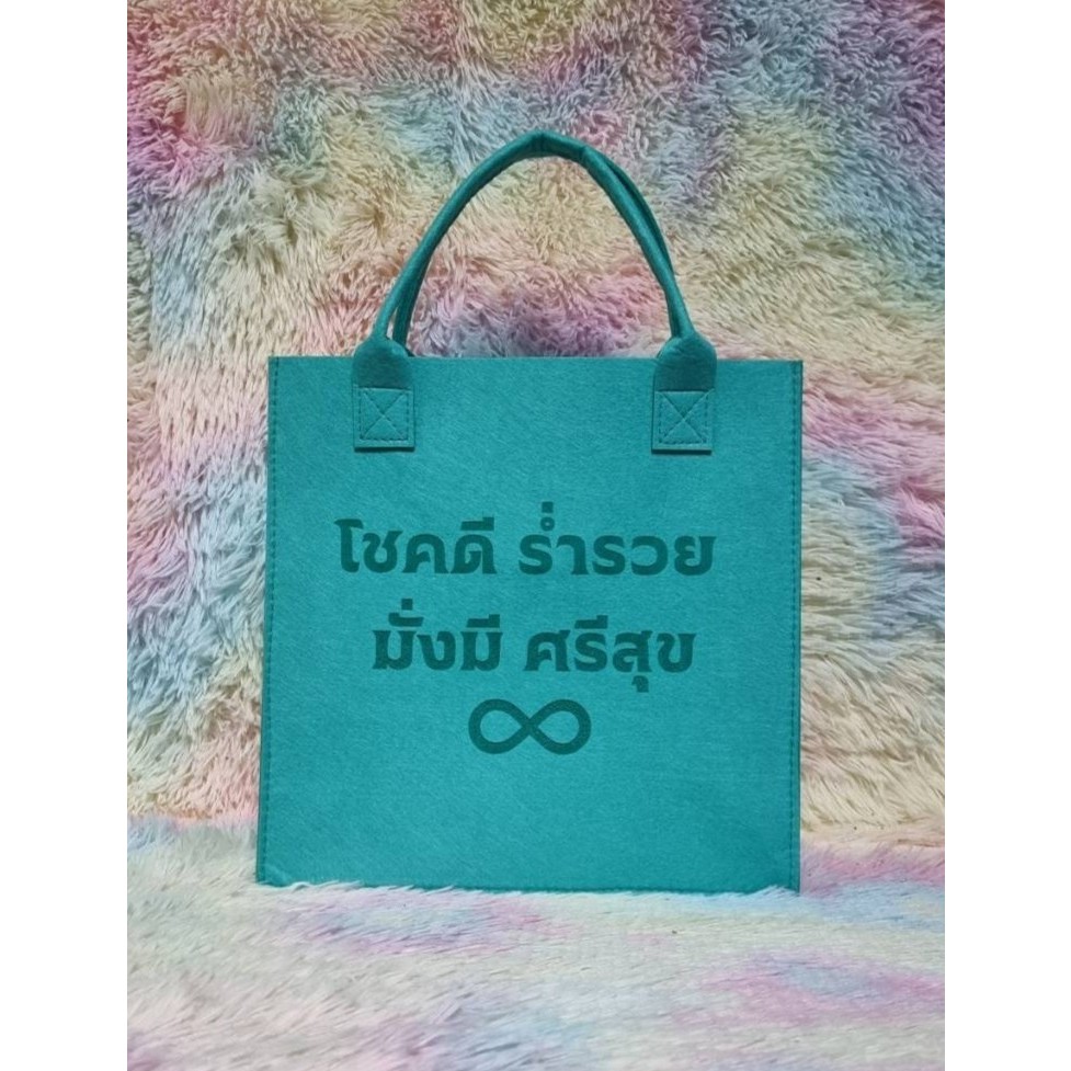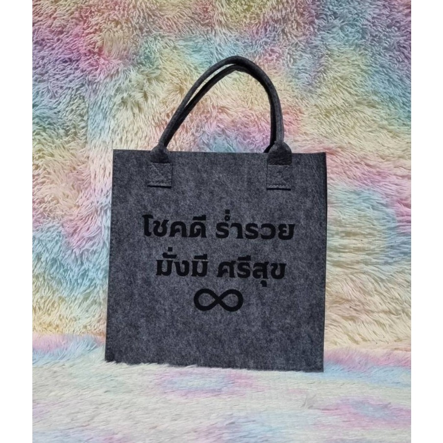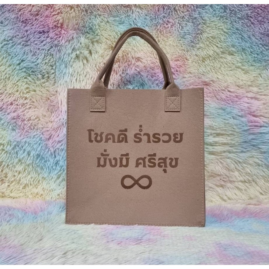 กระเป๋าผ้าสักหลาด “โชคดี ร่ำรวย มั่งมี ศรีสุข” ตัวหนังสือเลเซอร์ ถือแล้วเฮงใช้แล้วปัง ส่งเร็วจากไทย ขนาด 31x31x13cm