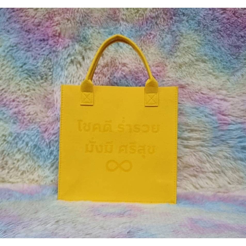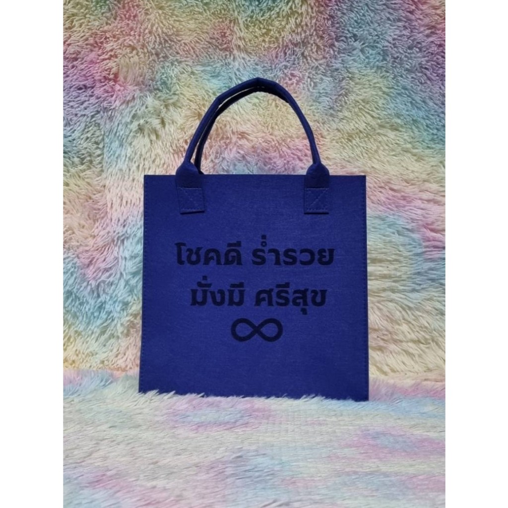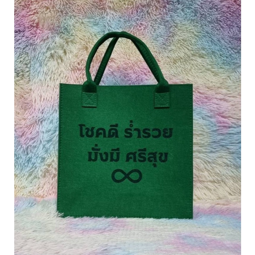 กระเป๋าผ้าสักหลาด “โชคดี ร่ำรวย มั่งมี ศรีสุข” ตัวหนังสือเลเซอร์ ถือแล้วเฮงใช้แล้วปัง ส่งเร็วจากไทย ขนาด 31x31x13cm