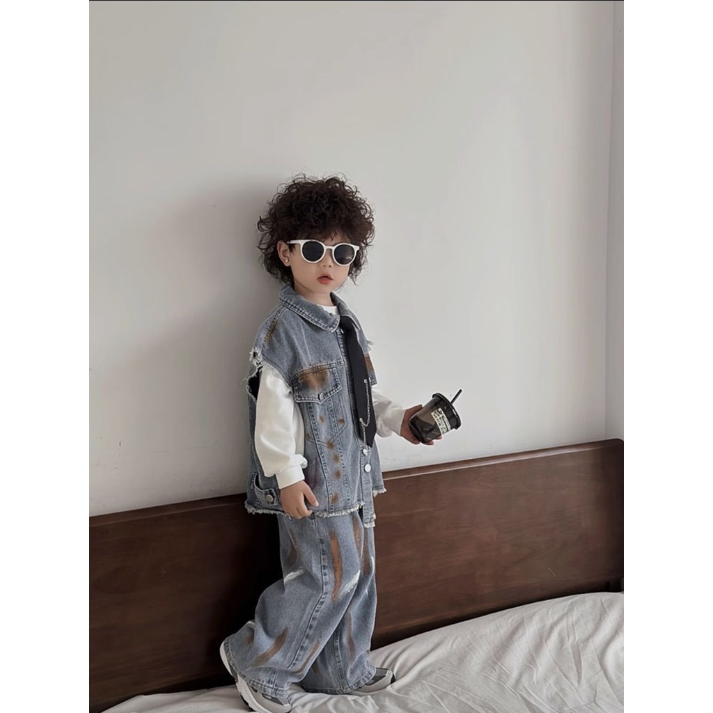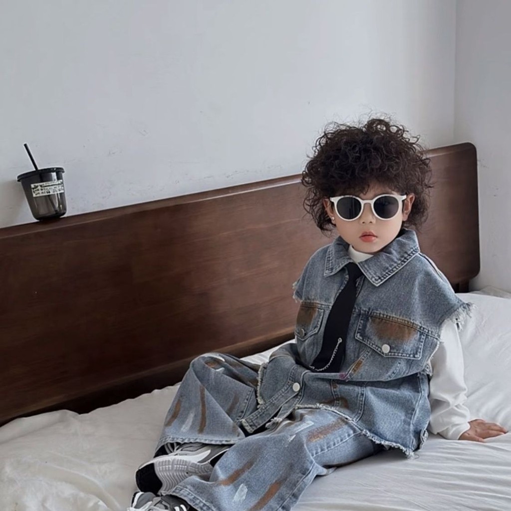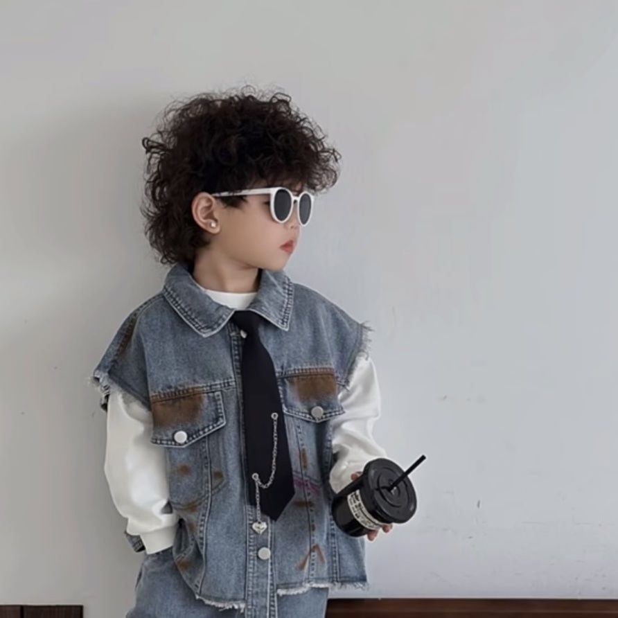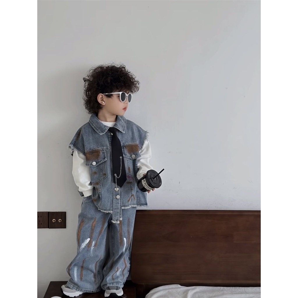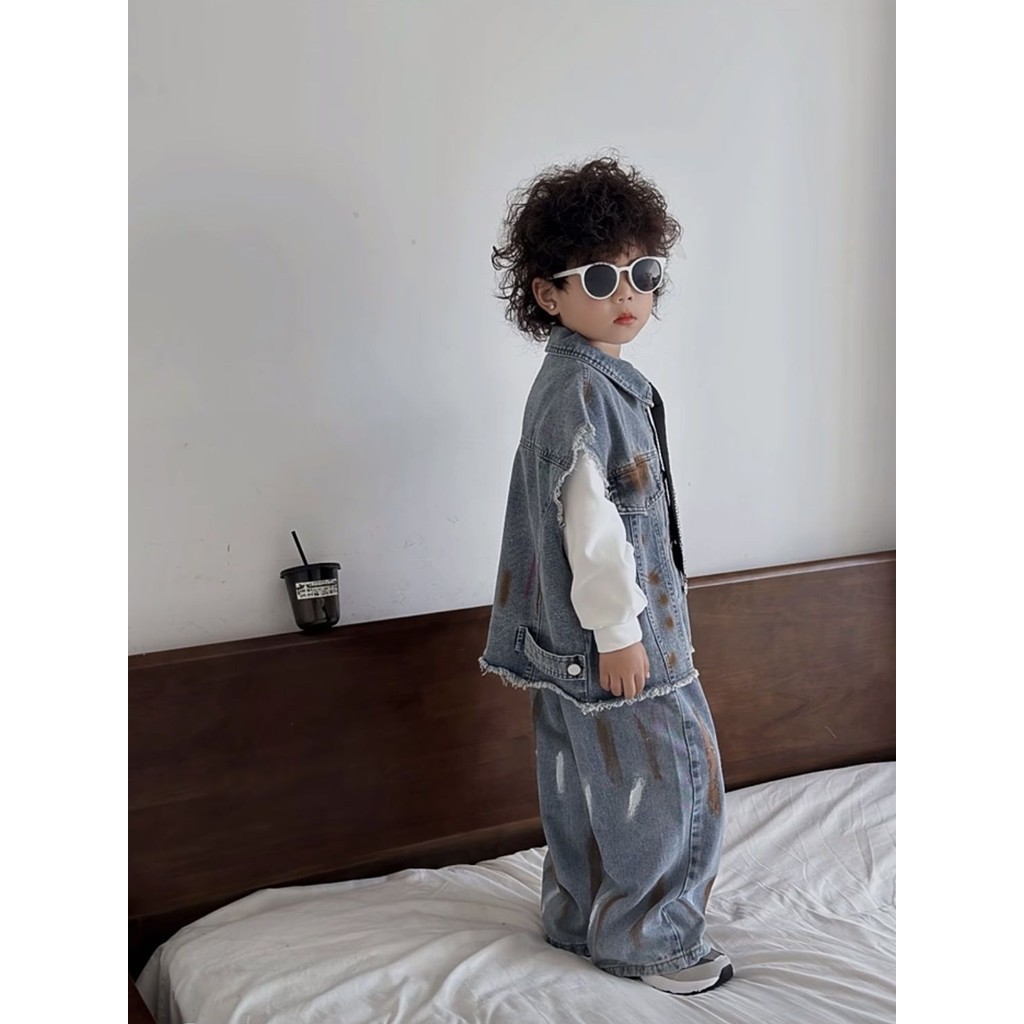 เสื้อกั๊กยีนลําลอง สองชิ้น แฟชั่นฤดูใบไม้ผลิ และฤดูใบไม้ร่วง สไตล์ตะวันตก สําหรับเด็กผู้ชาย
