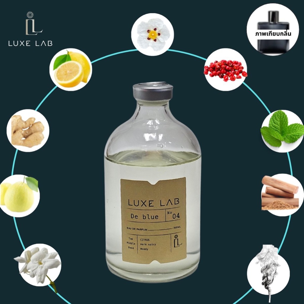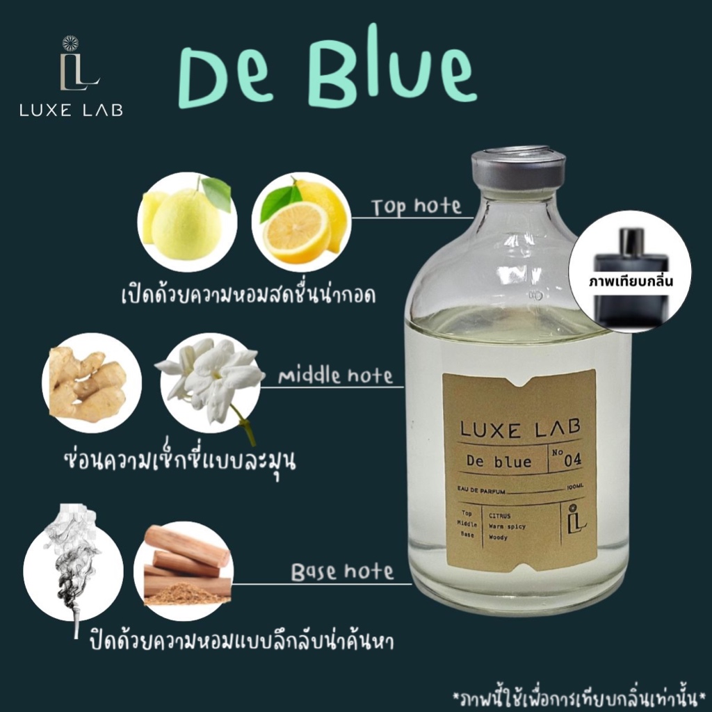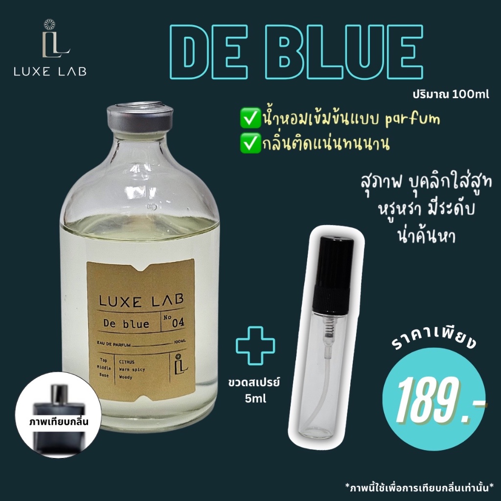 ปริมาณ 100ml พร้อมขวดสเปรย์ 5 ml 1 ขวด No.04 De blue ความเป็นอิสระและความสง่างามทุกก้าวย่างที่นำเสนอความเป็นชายชาตรี สดชื่นด้วยกลิ่นแรกที่ลอยมาของซีตรัสเผยกลิ่นอายอันสดใสคละเคล้าเกรฟฟรุ๊ต และกลิ่นยางไม้ ปิดท้ายด้วยความหอมนุ่มนวลล้ำลึกของกลิ่นฐานจากกำยาน