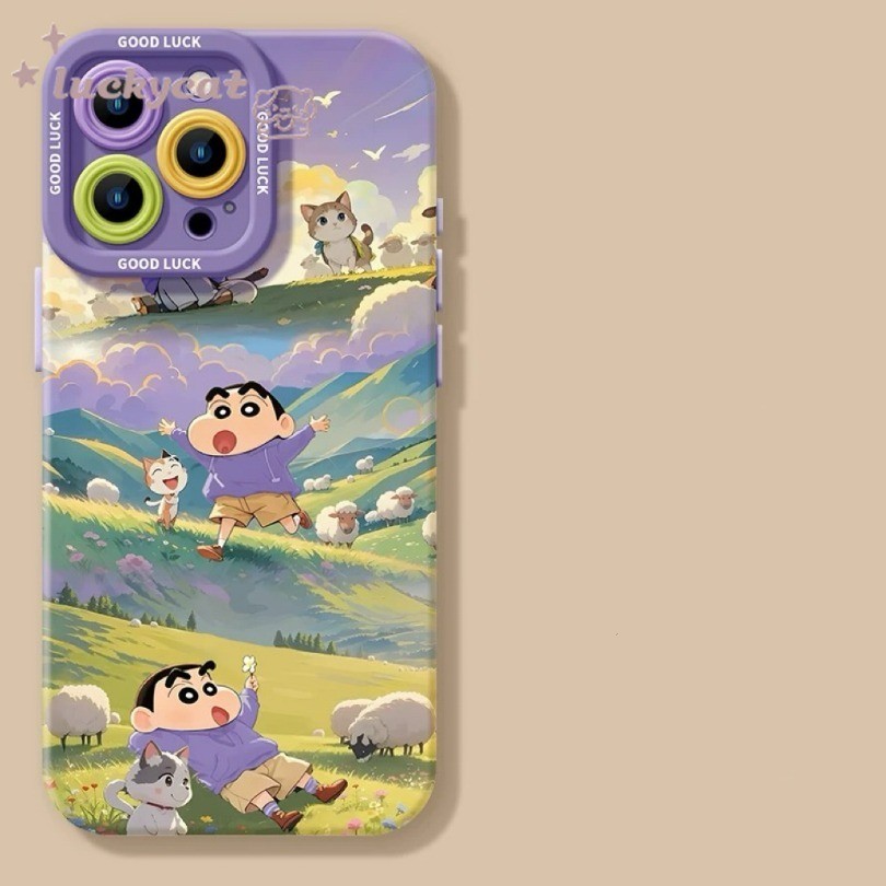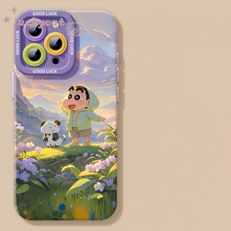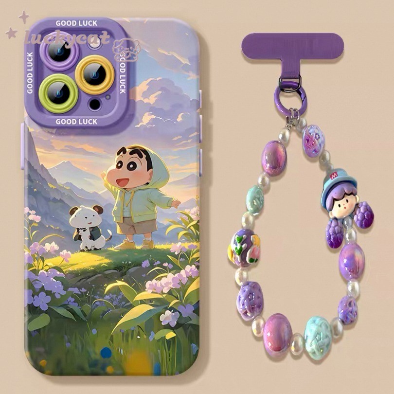 เข้ากันได้กับ iPhone 16 15 14 13 12 11 Pro Max X Xr Xs Max 7 8 Plus SE2020 เคสโทรศัพท์น่ารักเล่นในภูเขาเครยอนชินจัง + Lanyard ฝาหลังแบบนุ่ม