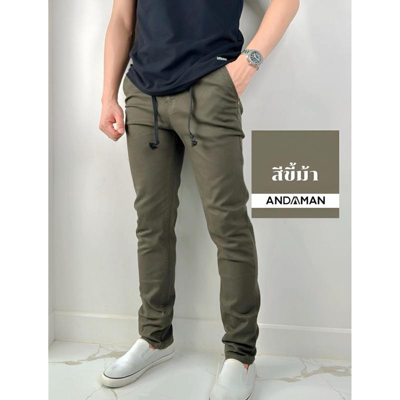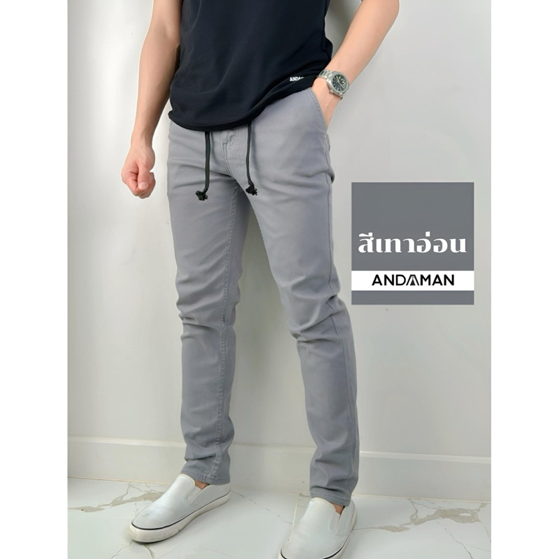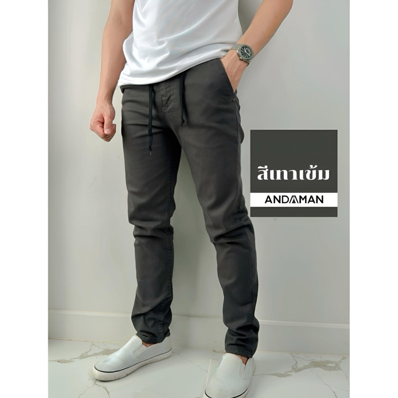 กางเกงขายาวผู้ชายเอวยางยืด มีเชือกผูก ขากระบอกเล็กผ้ายืด (เอวสม๊อค J40)