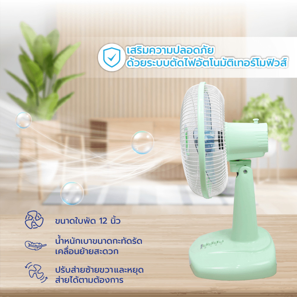 INOVA พัดลมตั้งโต๊ะ 12 นิ้ว รุ่นHG-A1202 สีเขียว เป็นพัดลมที่ตอบโจทย์การใช้งานในชีวิตประจำวัน ด้วยดีไซน์ที่สวยงาม ประสิทธิภาพในการทำความเย็น และความปลอดภัยที่ได้มาตรฐาน เหมาะสำหรับใช้ในห้องนอน ห้องทำงาน หรือพื้นที่ขนาดเล็กต่างๆดีไซน์: ดีไซน์เรียบง่ายทันสม