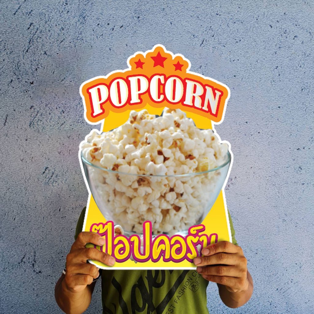 ป้ายป๊อปคอร์น ป้ายpopcorn ขนาดป้ายแนะนำ (A3) ขนาด 30×42 ซม. ฟิวไดคัท กันน้ำ กันแดด