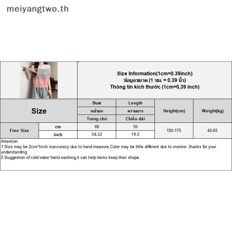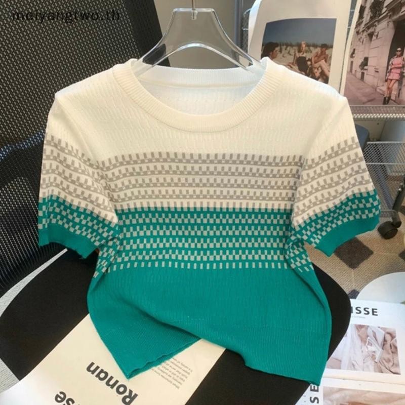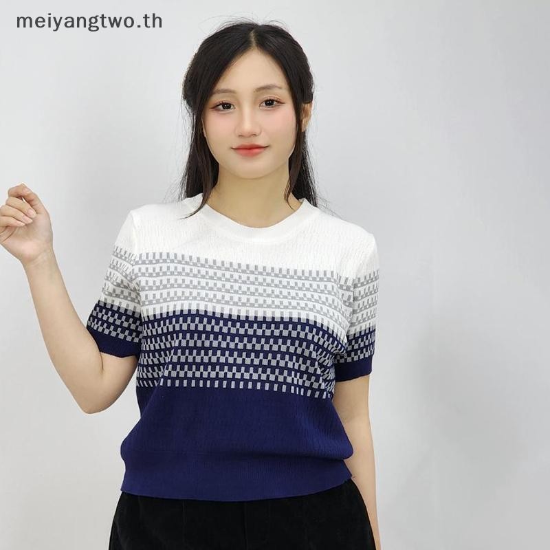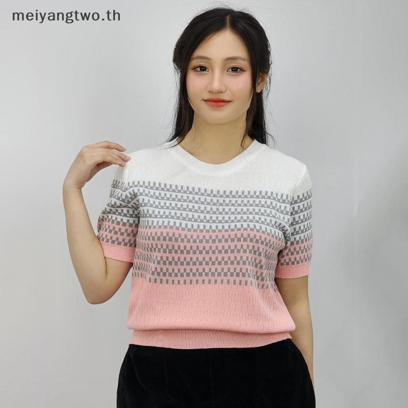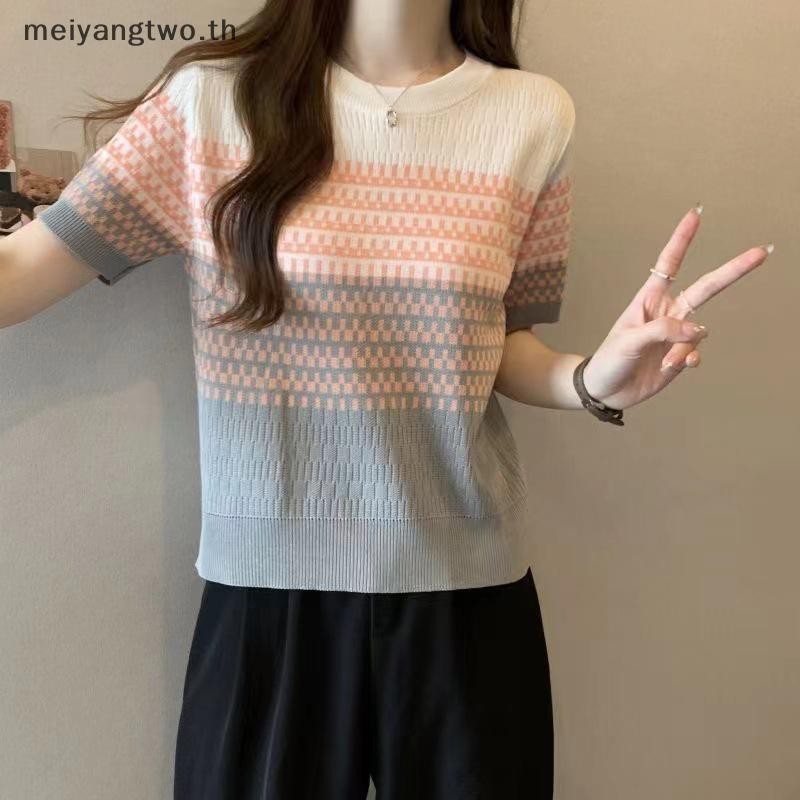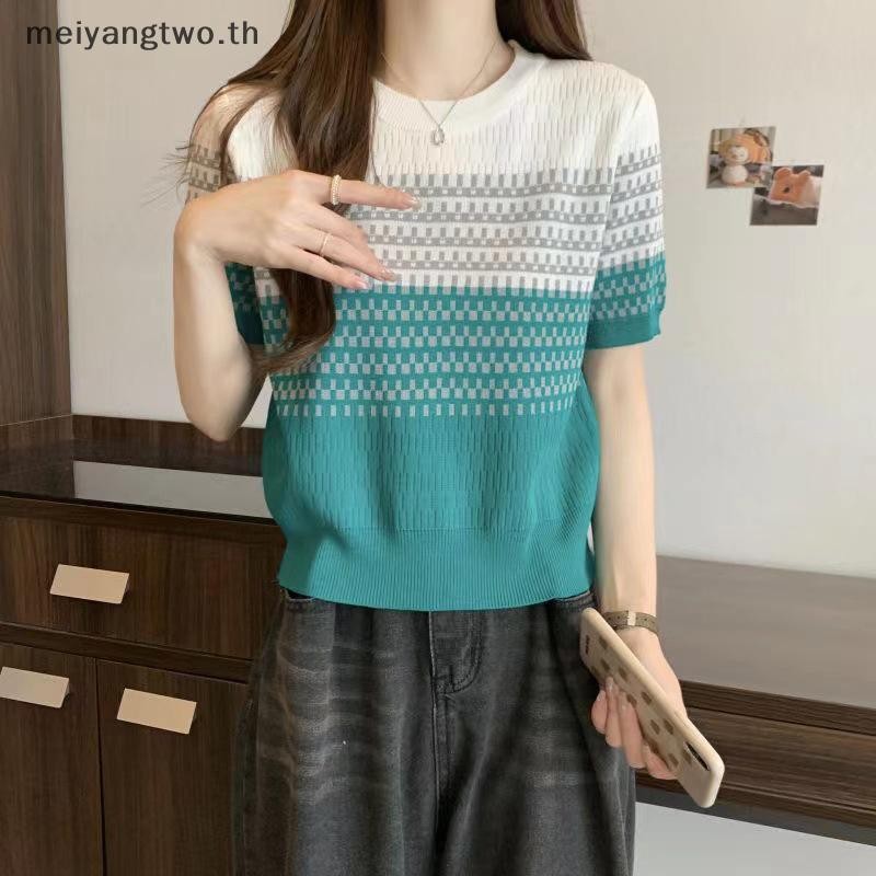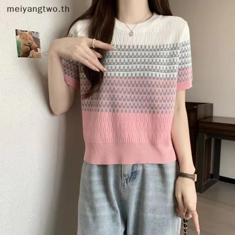 Meiyangtwo.th ฤดูร้อนแฟชั่นไล่โทนสีลายคอกลมแขนสั้นลําลองหลวมถักเสื้อยืดใหม่