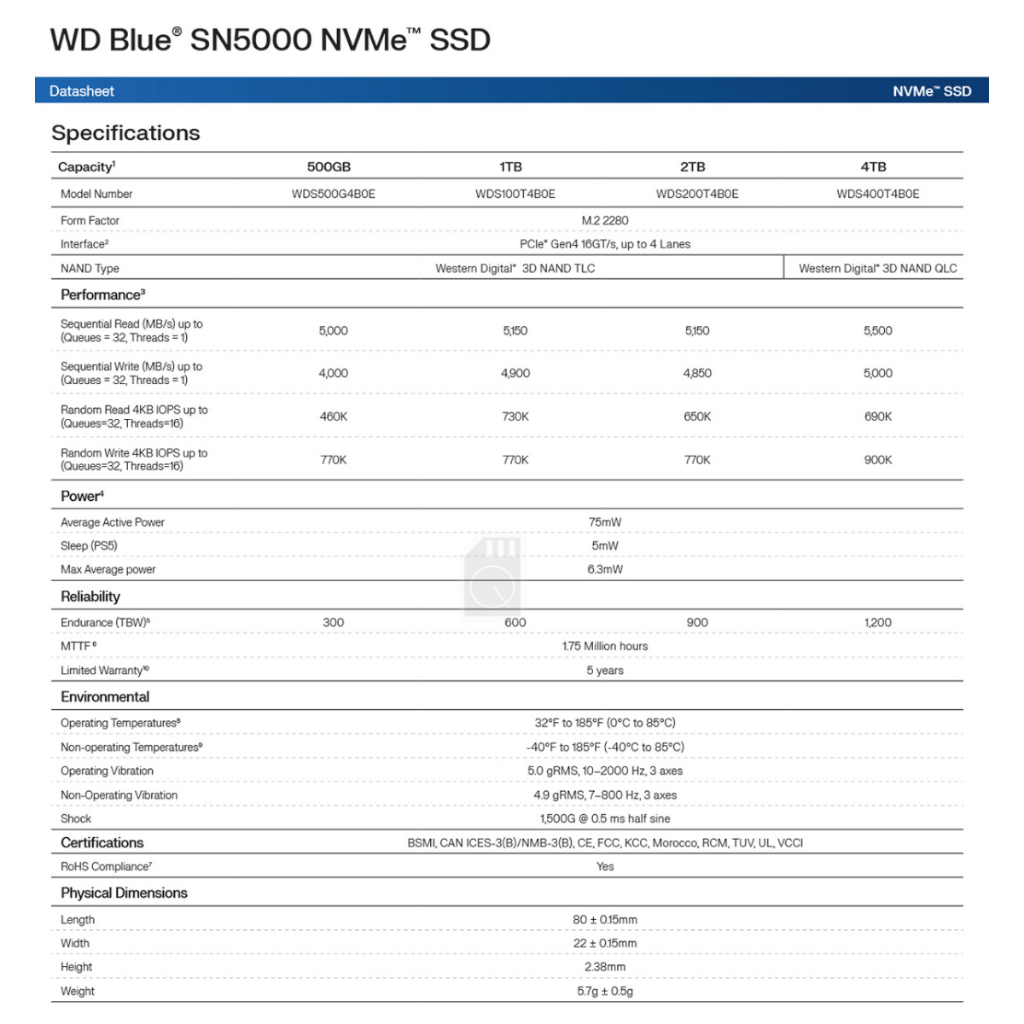 WD Blue SN5000 SSD 2TB ,1TB M.2 2280 NVMe Gen4 Speed Up to 5,150MB/s ,5Y WDS100T4B0E , WDS200T4B0E