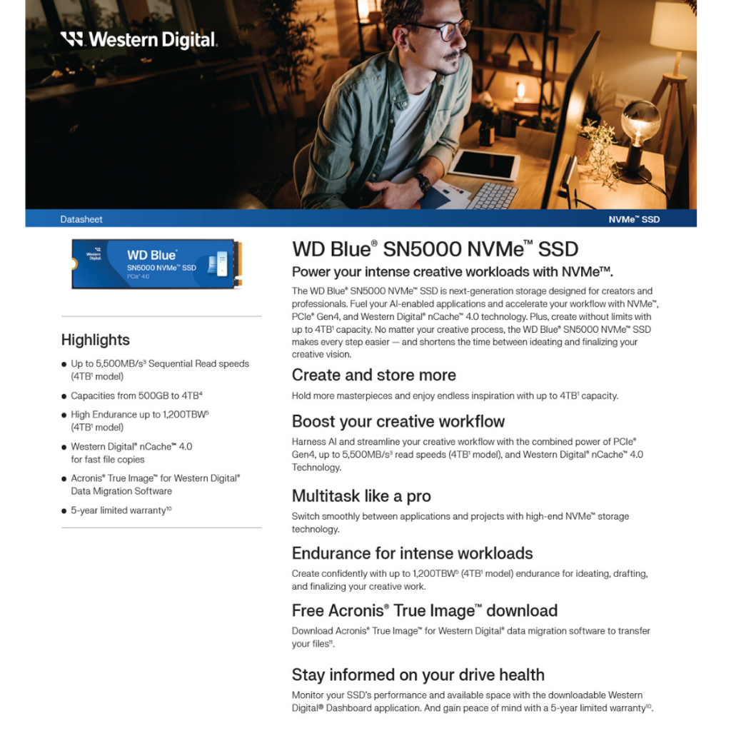 WD Blue® SN5000 NVMe™ SSD คืออุปกรณ์จัดเก็บข้อมูลยุคต่อไปที่ออกแบบมาสำหรับครีเอเตอร