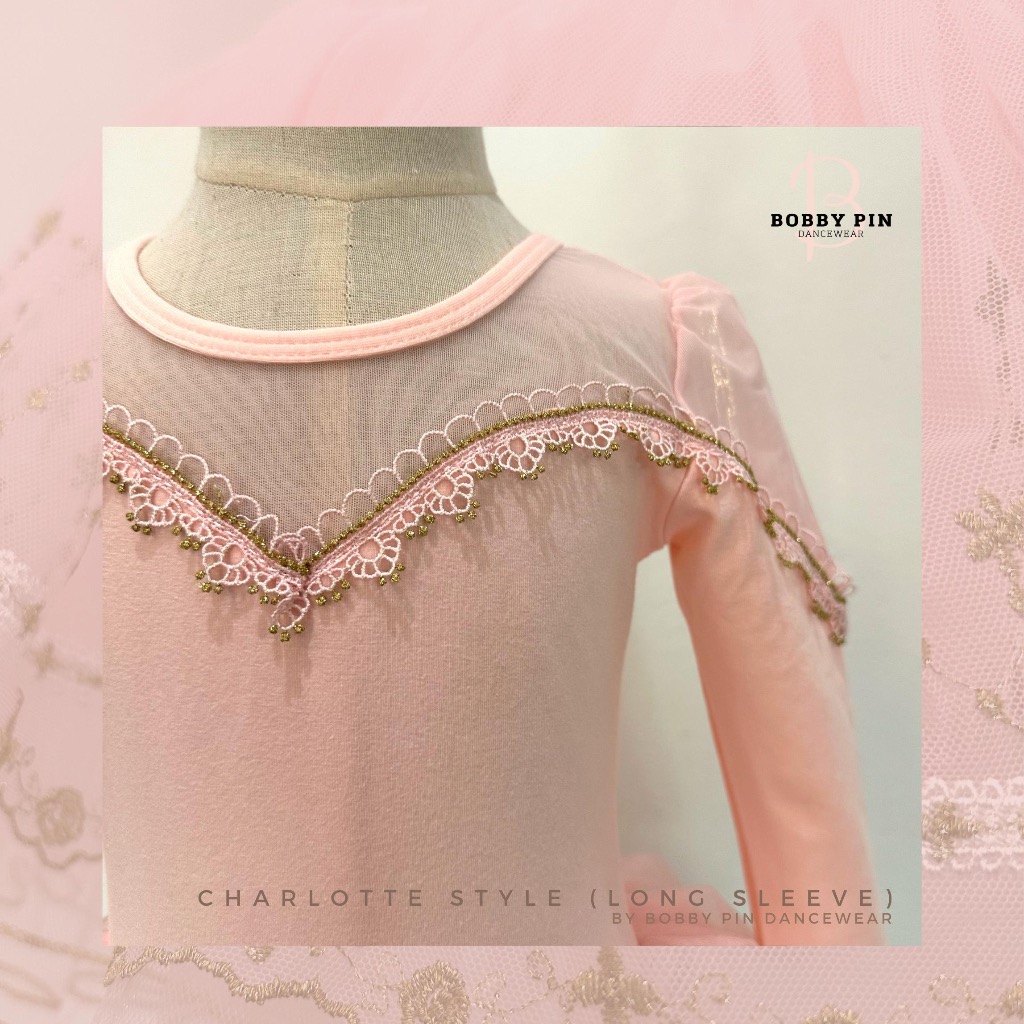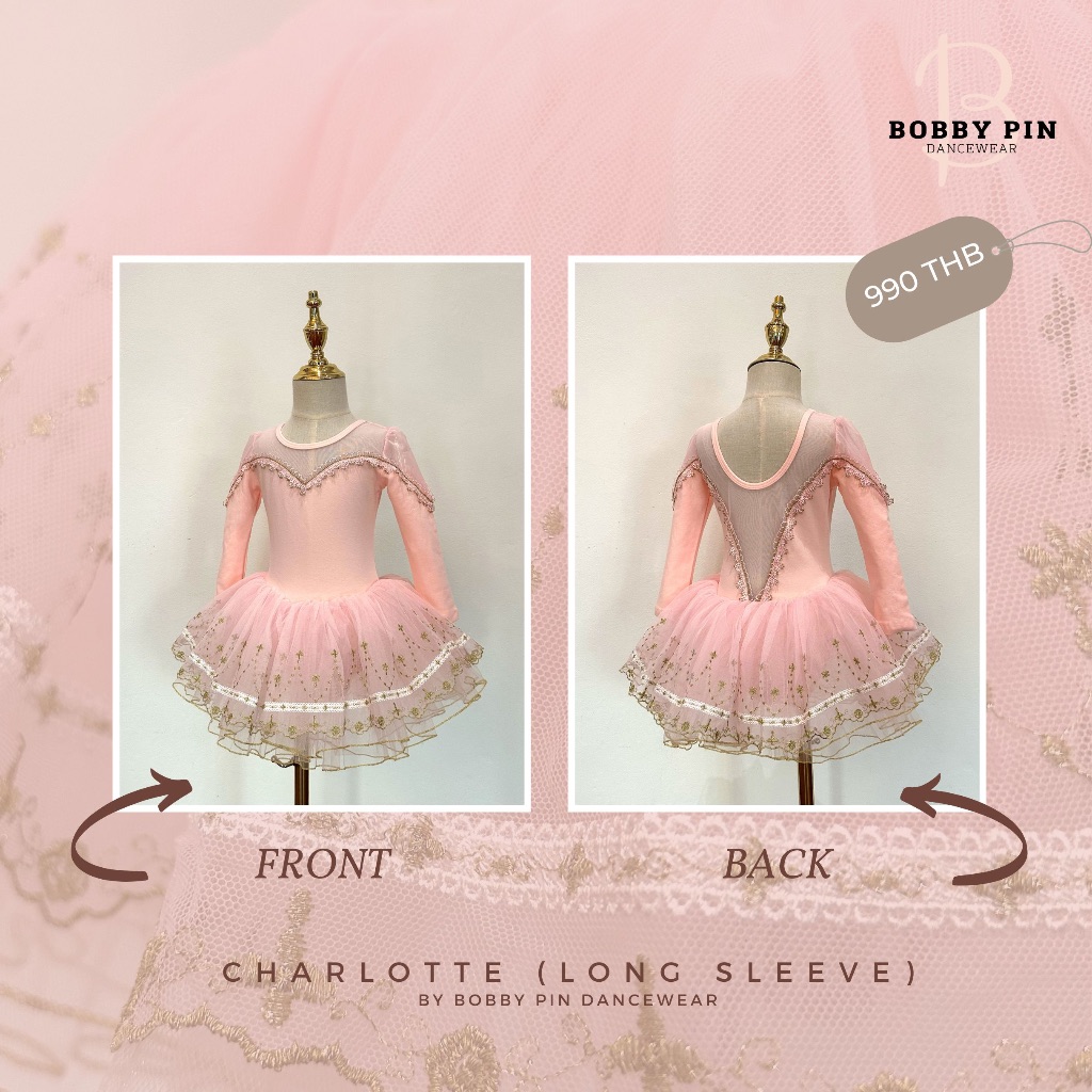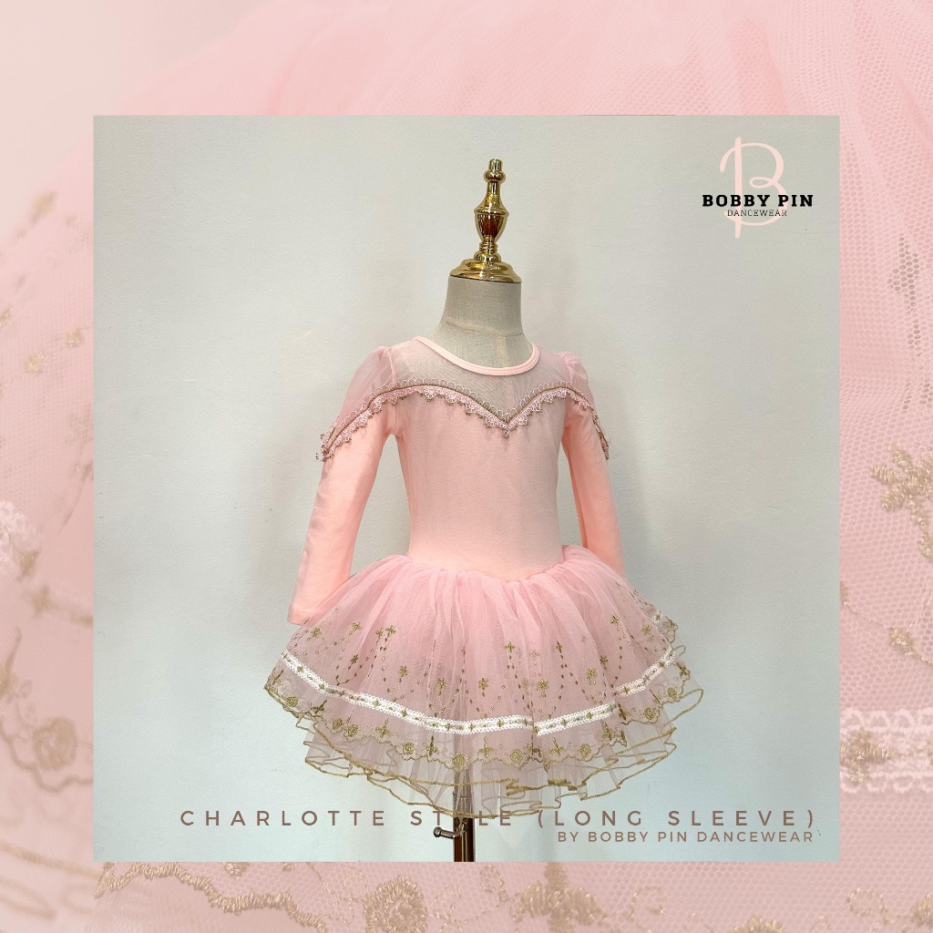 - ชุดบัลเล่ต์เด็กเจ้าหญิง Charlotte Style แบบแขนยาว (long sleeve) สี cotton pink ทรงเข้ารูปประดับด้วยด้ายทอง เนื้อผ้านิ่มสบาย ใส่แล้วไม่คัน