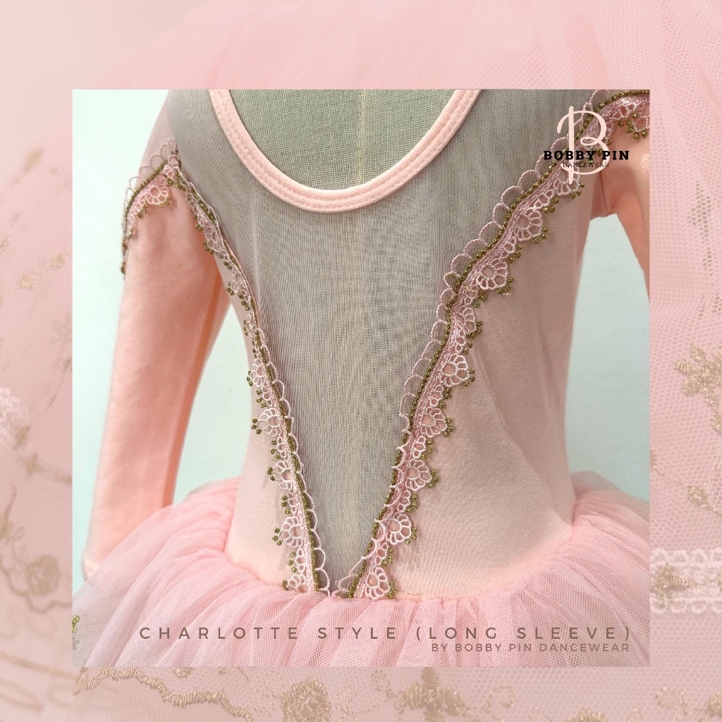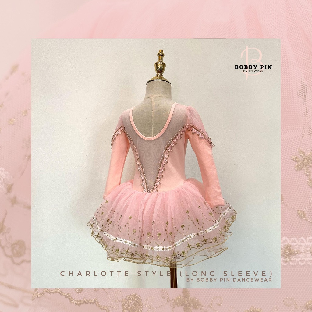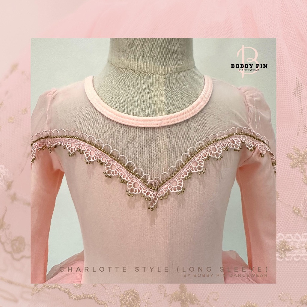 - ชุดบัลเล่ต์เด็กเจ้าหญิง Charlotte Style แบบแขนยาว (long sleeve) สี cotton pink ทรงเข้ารูปประดับด้วยด้ายทอง เนื้อผ้านิ่มสบาย ใส่แล้วไม่คัน