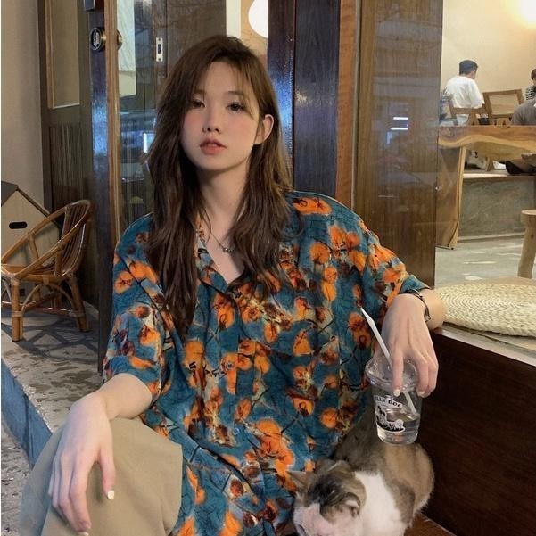 MIMI&DIDI.เสื้อเชิ้ตแขนสั้นลายดอกไม้ย้อนยุค เสื้อฝรั่งเศสหลวม ฤดูร้อน สไตล์ย้อนยุคอันแสนหวาน ผ้าบางและสวมใส่สบาย#W371