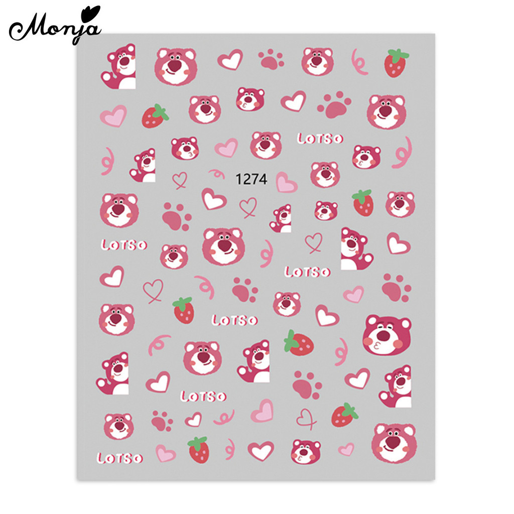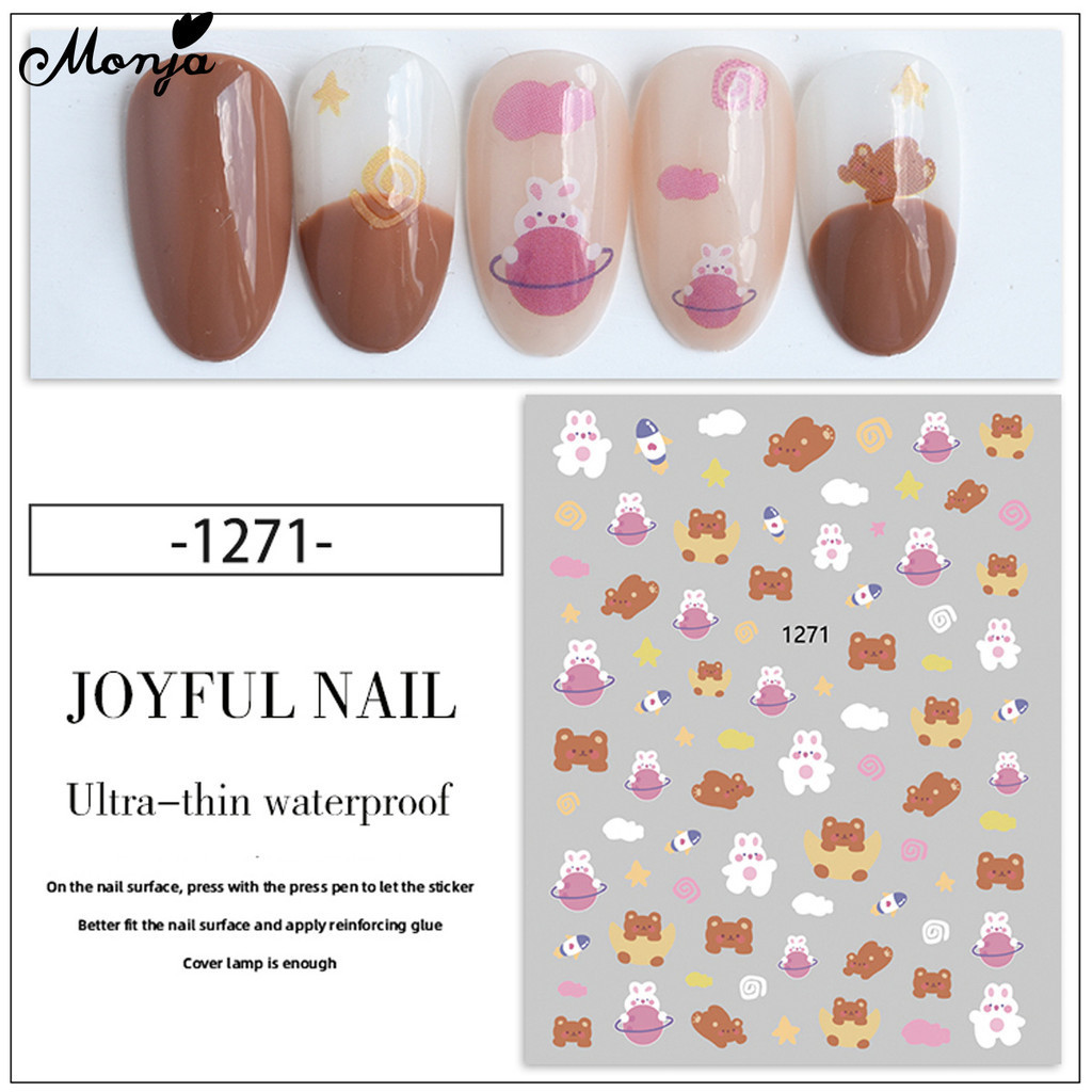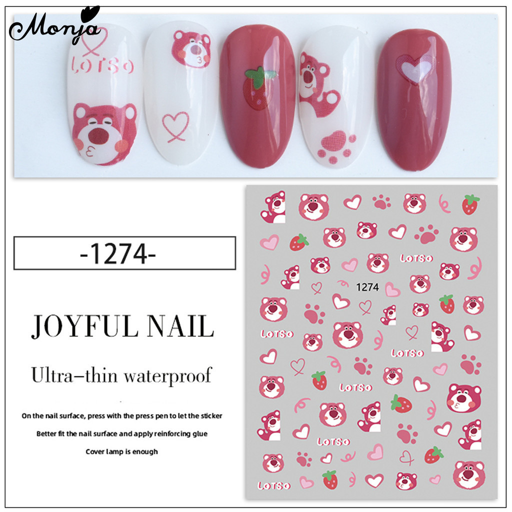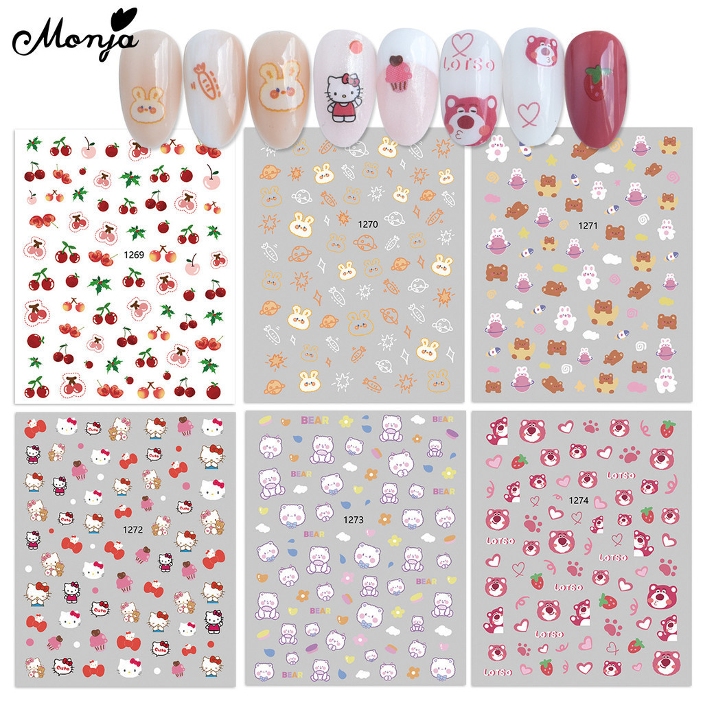 Monja สติกเกอร์โฮโลแกรม ลายแมว กระต่าย หมี สตรอเบอร์รี่ มีกาวในตัว สําหรับตกแต่งเล็บ DIY