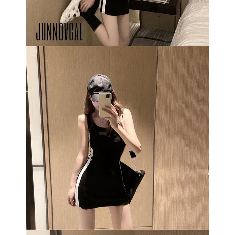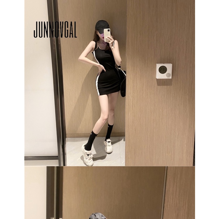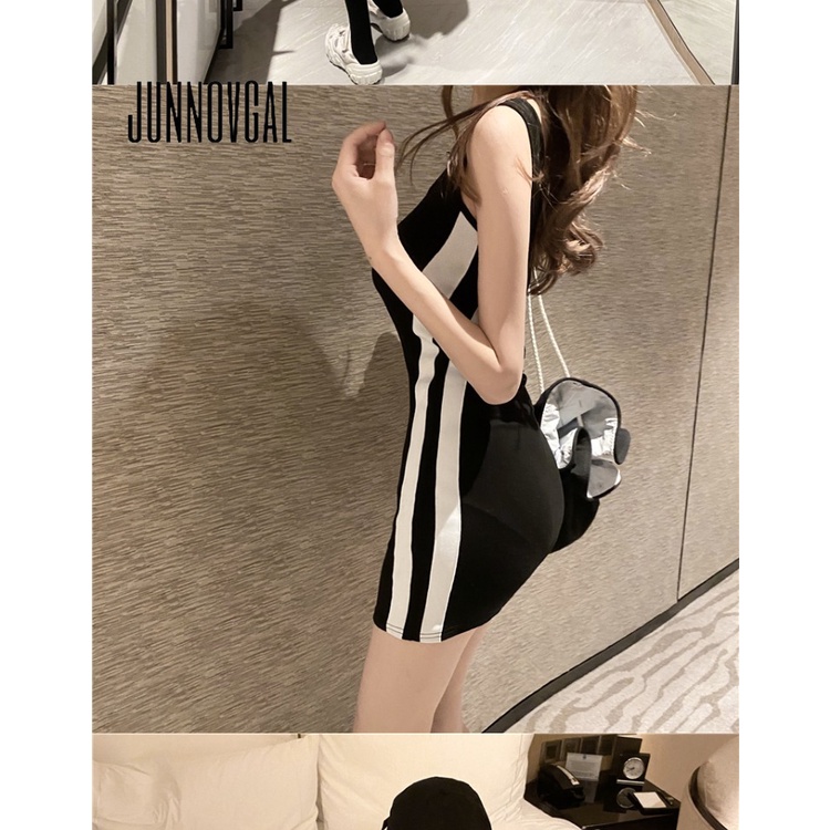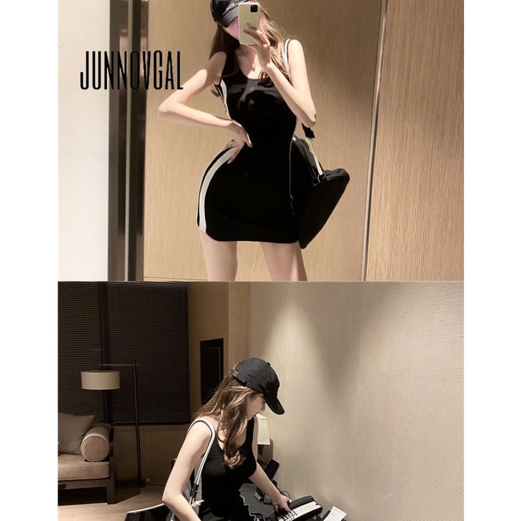 JUNNOVGAL มินิเดรสผู้หญิงแฟชั่นสไตล์ใหม่แขนกุดสีตัดกันคอยู