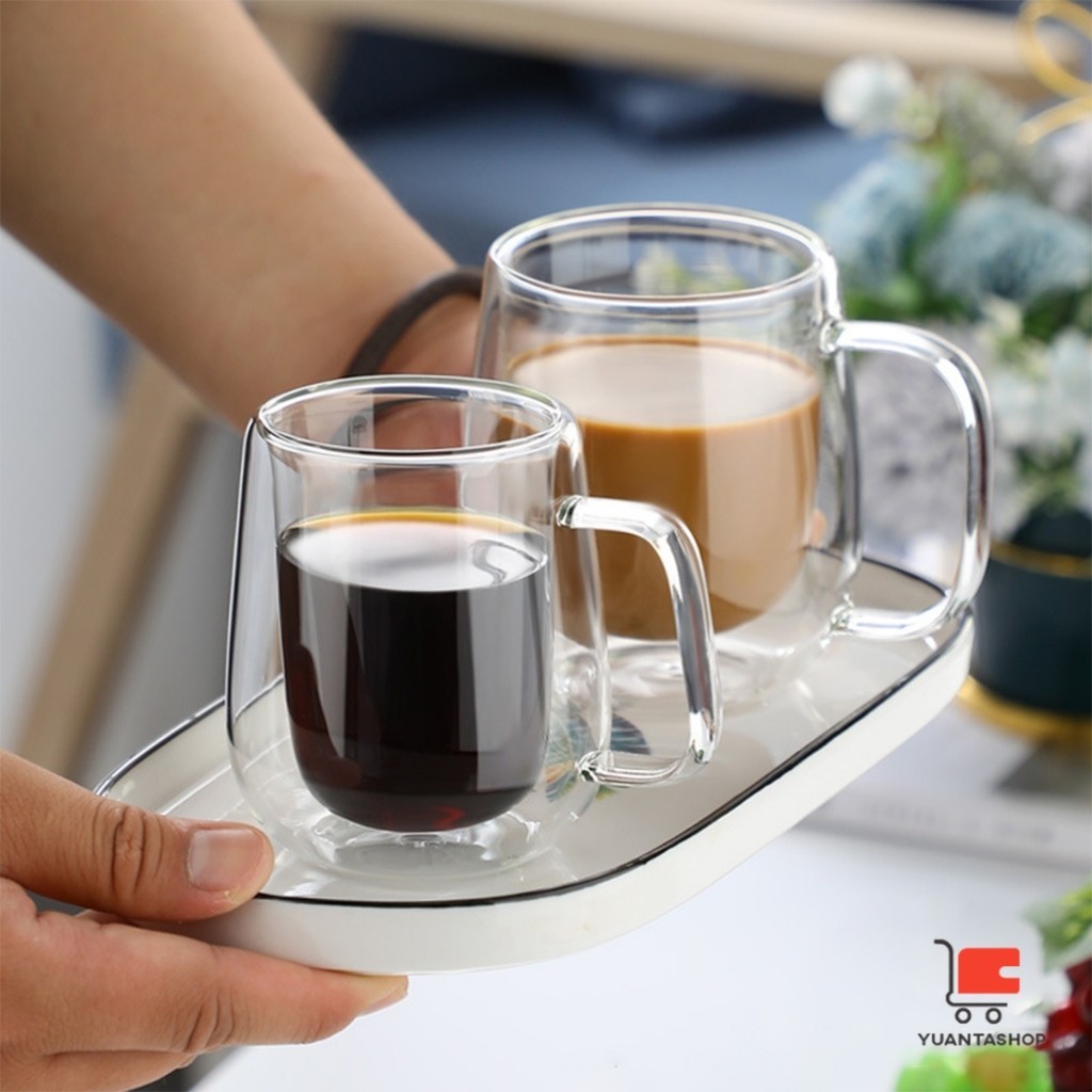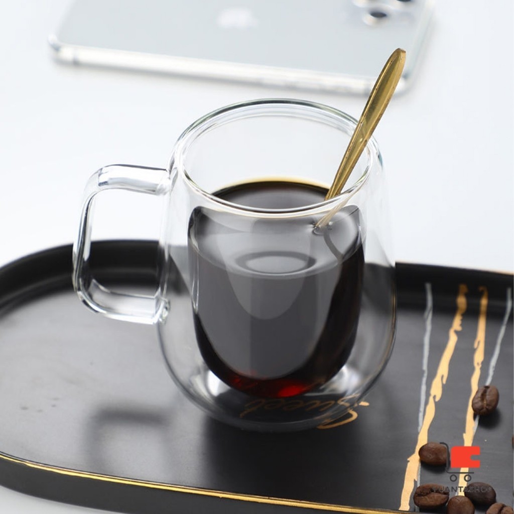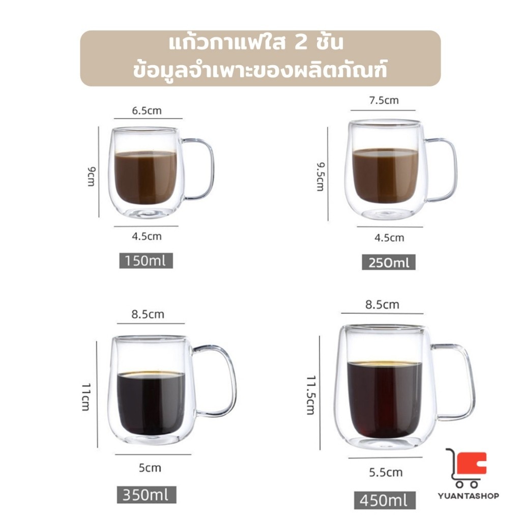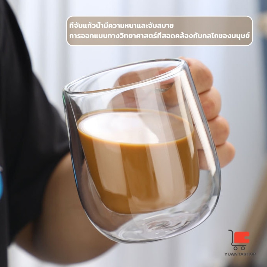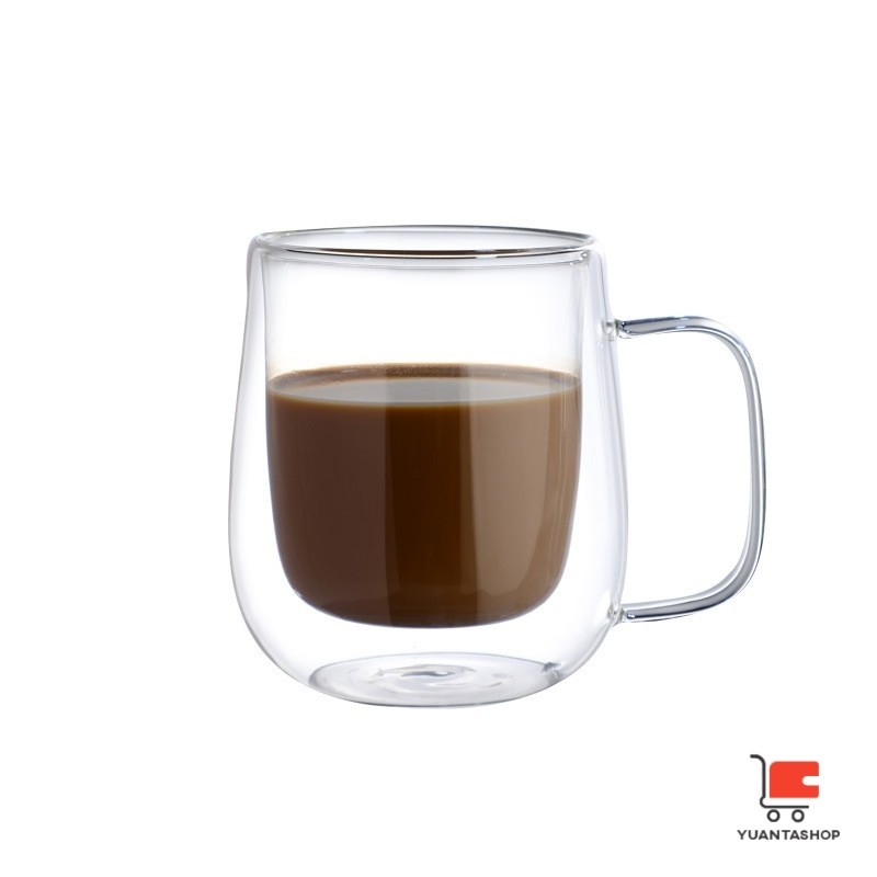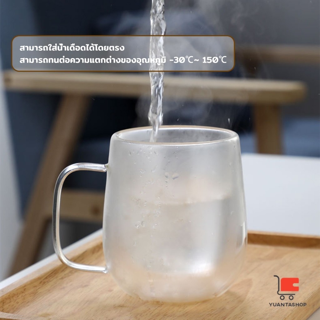 YT แก้วกาแฟใส 2 ชั้น 450ml กันความร้อน ใส่น้ำร้อนเย็นได้ ถ้วยนม กาแฟ มีหูจับ Double-layer glass