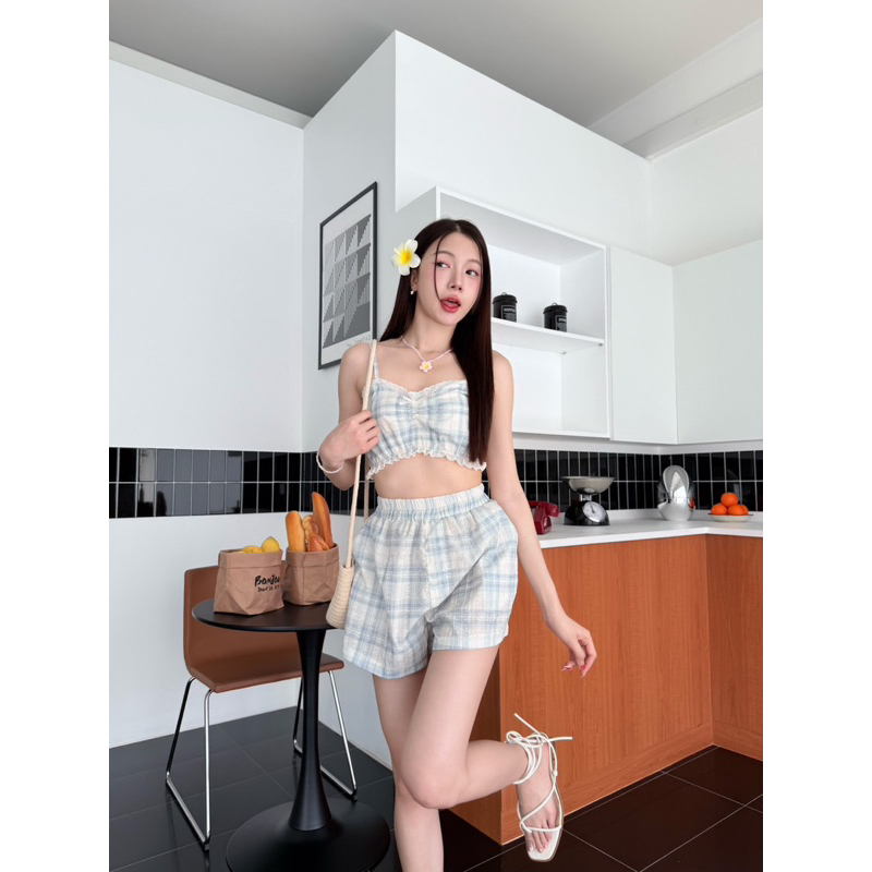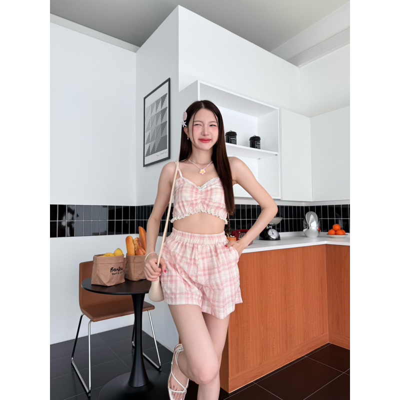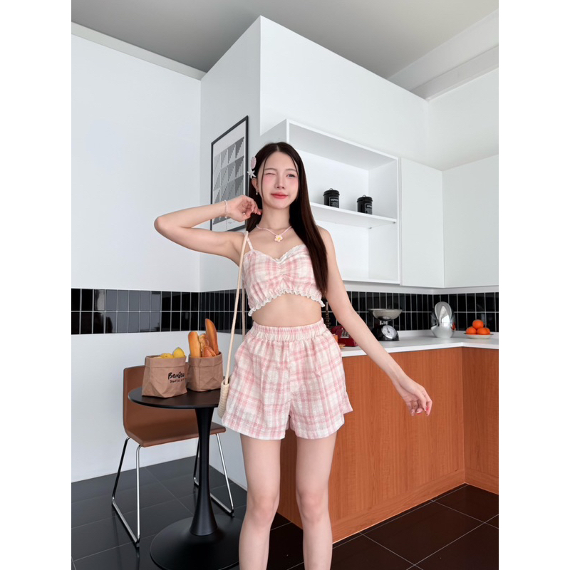 ? Sofia Set ชุดเซตเสื้อครอปบราสายเดี่ยวย่นอก+กางเกงขาสั้นเอวยางยืด งานลายสก๊อต