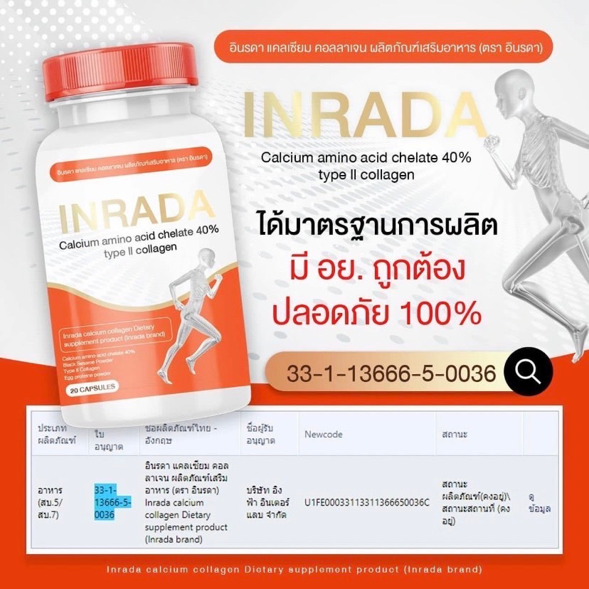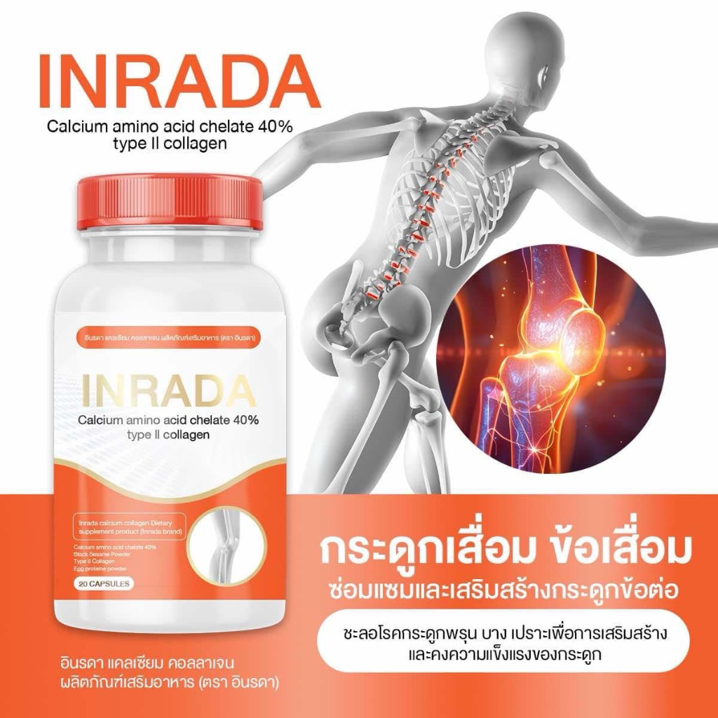 แคลเซี่ยม คอลลาเจน ไทพ์ทู ผสม วิตามิน อินรดา Inrada Calcium Collagen type ll Vitamin 1 ขวด 20 แคปซูล