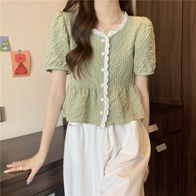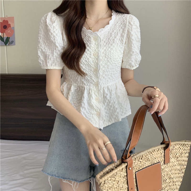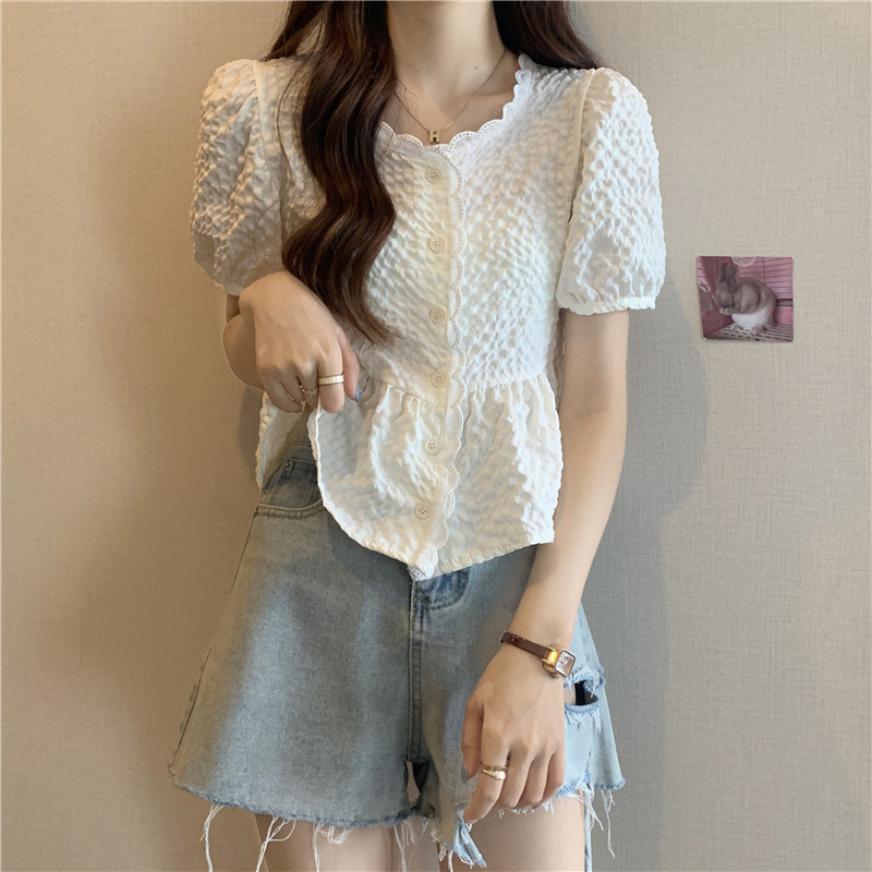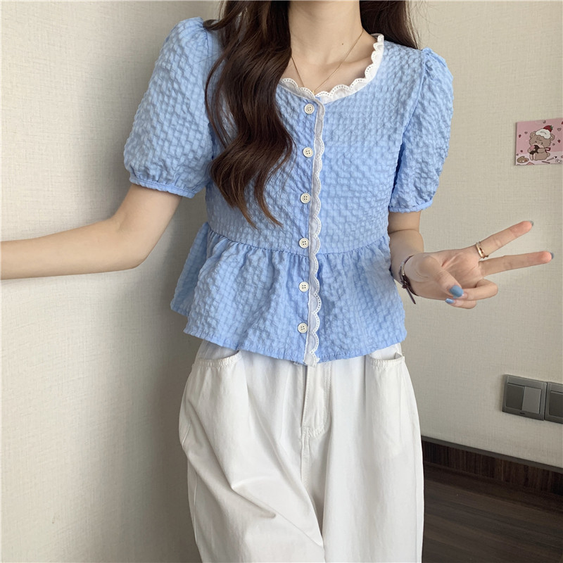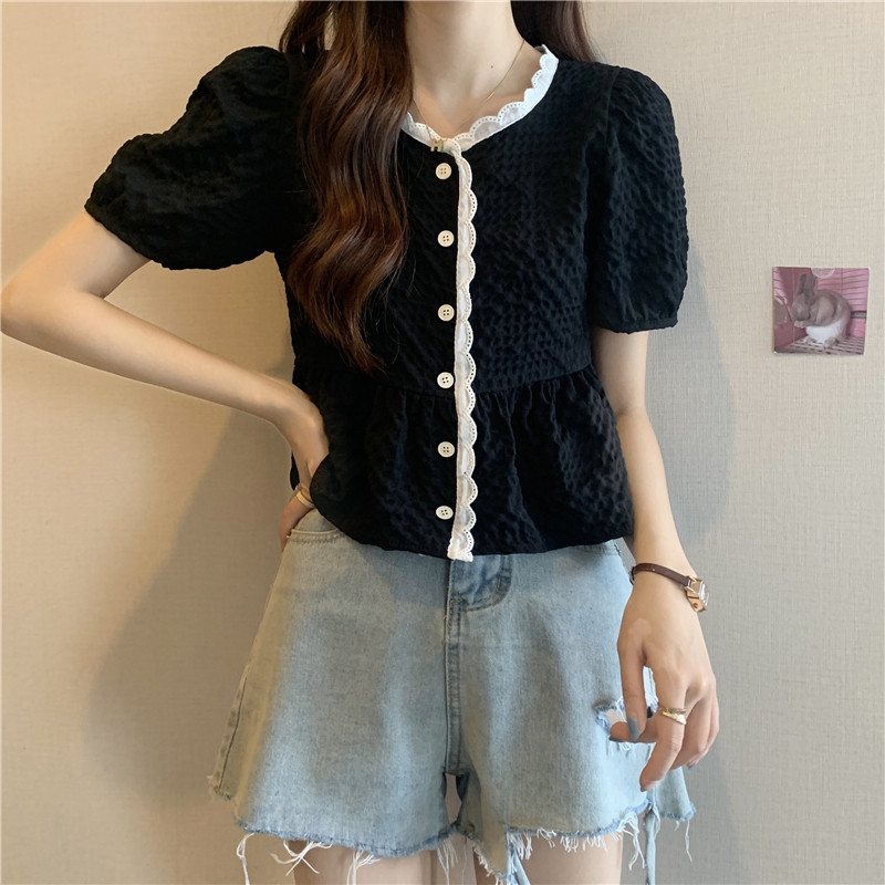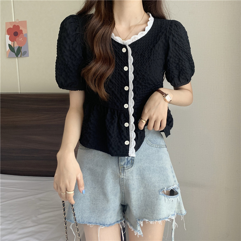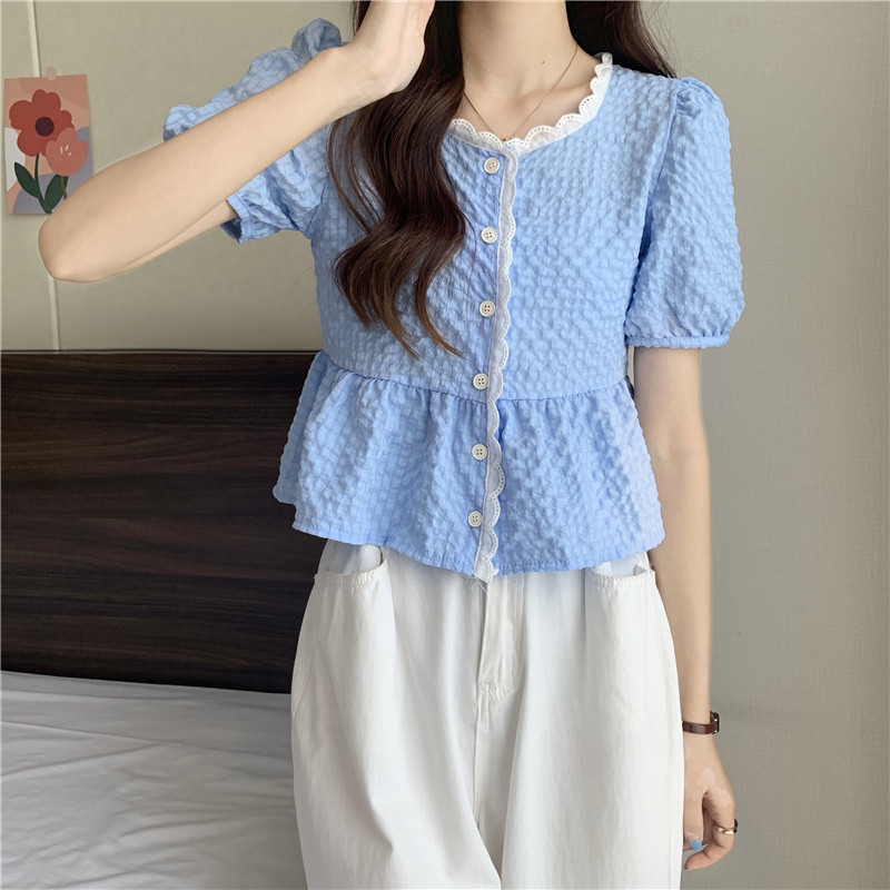DODO⭐️สินค้าพร้อมส่ง⭐️เสื้อยืดผ้านุ่มๆดีเทลปักลายลูกไม้ตรงคอและรางดุมสีจั้มเอวเล็กน้อยสีพื้น(60109)