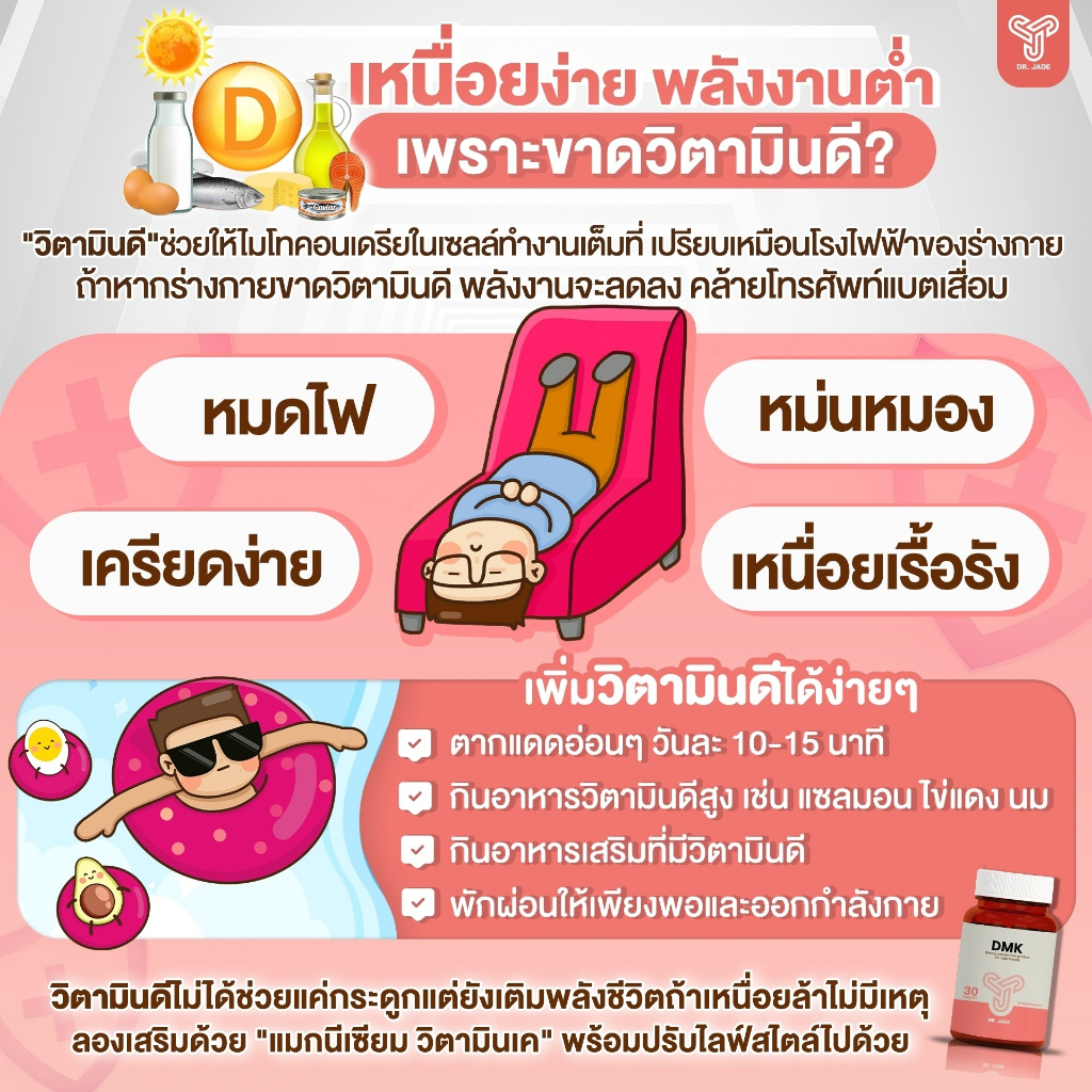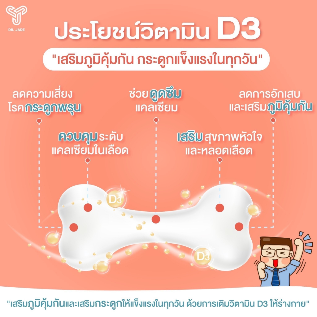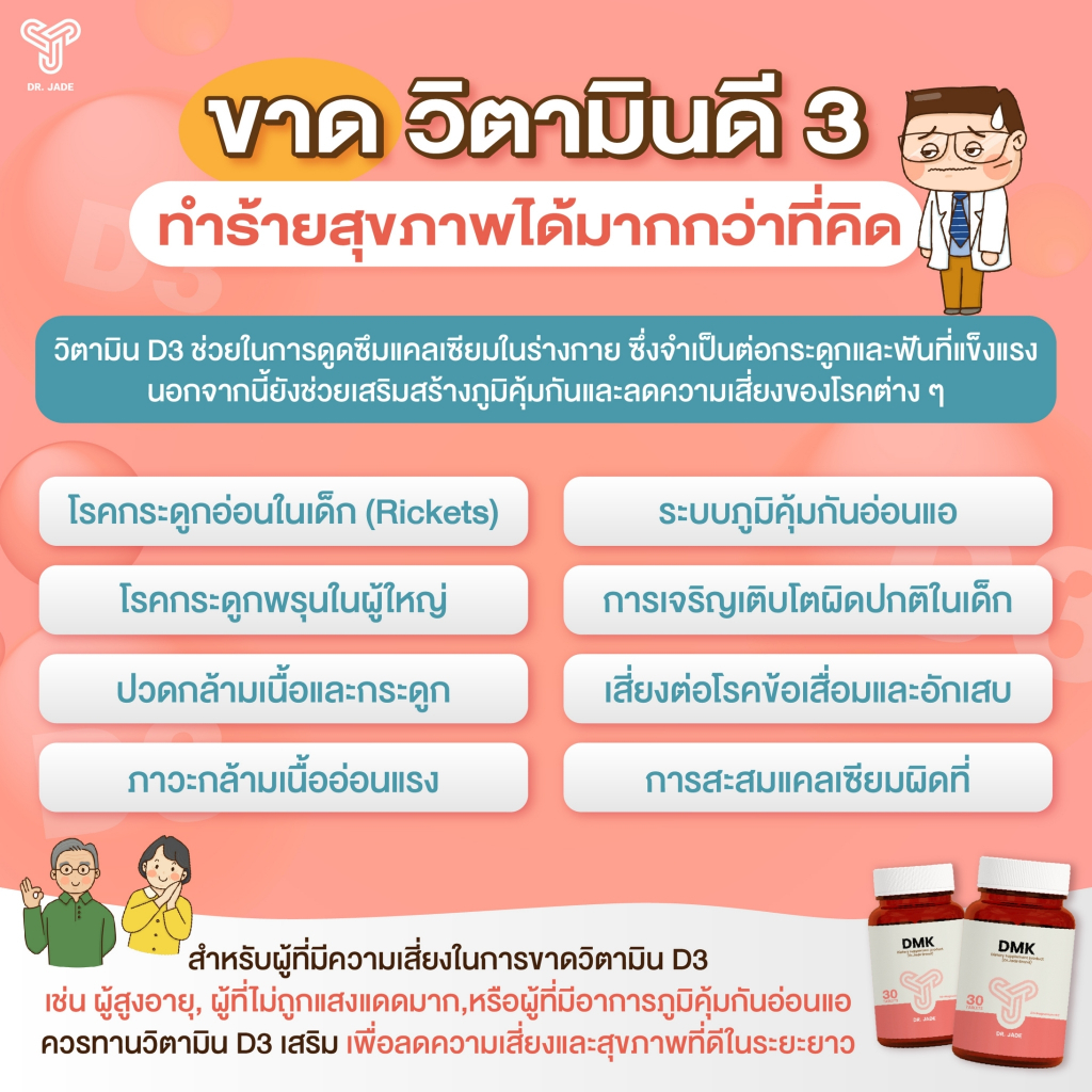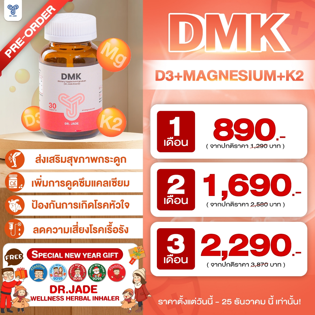 จุดเด่น : DR.JADE DMK (D3 + Magnesium + K2) 1 กระปุก 30 เม็ด ราคา 890 บาท 1. ดูแลกระดูกและฟัน ช่วยเสริมการดูดซึมแคลเซียมและนำไปใช้ในร่างกายอย่างมีประสิทธิภาพ 2. ปรับสมดุลแร่ธาตุในร่างกายแมกนีเซียมช่วยกระตุ้นระบบเอนไซม์และเสริมความแข็งแรงให้กระดูก 3. เส